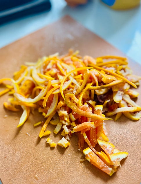 Thank you for reading Between the Layers! Please enjoy and share this free post with your friends. The Bittersweet Beauty of Marmalade - No. 274Tasting orange marmalade with cheese at a local restaurant brought back a flood of memories from France + a very nice recipeA LARGE YELLOW PYREX BOWL once went missing from our kitchen cabinet. It wasn’t used for any other purpose than making marmalade once citrus came into season. Like a big measuring cup, my grandmother filled the bowl to the top with cut oranges and lemons. She let the fruit soak in water two days before she dragged out the cooking pot to simmer down the citrus—peels, fruit, and all—with sugar until syrupy. My mother searched for that bowl, but she didn’t seem concerned about its disappearance. She knew some cousin was surely in need of it to make marmalade, and it would reappear later. Which it did. Mostly that bowl sat at the far back corner of the cabinet because we didn’t make much marmalade. To us children, it was bitter and foreign, like Brussels sprouts or dark red wine. We wanted no interaction with marmalade until we grew up and tasted it all over again. Through the years, I’ve attempted jams and jellies, and I am being perfectly honest here, it’s been hit or miss. I don’t make enough of them to get good at it. And I once took courses in making them through the DeKalb County Extension Service in Georgia and became a ‘’master’’ fruit preserver, but you know and I know that skills only develop with time and a lot of experience. The younger me had better things to do than stand at the stove in the heat of the summer. Maybe I felt I wasn’t old enough yet to be proficient at canning. That comes with gray hair and hip replacements, right? But in truth, a trip to France some forty years ago opened my eyes to a fresher, looser style of fruit preserves than I knew growing up. It was one of the many things I found irresistible about French culture. The syrupy preserves seemed deliciously romantic and a world away from the stiff and rigid marmalades made by my ancestors. They puddled on the plate, and while they might fail the test of the ‘’master’’ food preserver or dismay a state fair judge, when you dribbled them from the spoon onto a fresh croissant, they tasted of summer. I wondered still how to make them. So when I recently had dinner at a favorite East Nashville restaurant called Margot Cafe, and a citrus marmalade was puddling on the plate with a slice of well-aged, creamy cheddar and sourdough bread on which to spread the two, a flood of French fruit preserve memories came rushing back. The pairing of marmalade and cheese—sweet, tart, salty, and bitter blew my adult mind. I wanted to make that marmalade. I couldn’t think about anything else for days. I emailed the chef/owner Margot McCormack and told her I needed to talk to whoever made the marmalade. She said that would be Tom Huber, the pastry chef, and she’d have him contact me. The hours slowly passed, and I finally heard from Tom. It was like a good ole therapy session texting back and forth with him, with me divulging my desire for runny preserves, confessing my inability to make marmalade that I liked thus far, and begging childishly for his recipe. Not only did Tom agree with me about the beauty of loose jams and jellies, but he admitted he makes marmalade from a recipe they’ve had in Margot’s kitchen for years. Everyone who has done any pastry at the restaurant has made it. He’d be happy to share. And all of this was quite timely. I was heading to Florida to visit family. I knew there would be some interesting citrus there. I would make time for marmalade. Fortunately it was February, and there was plenty of citrus. The best marmalade is made from a medley of organic fruit, and we gathered a few blood oranges, some local tangerines, a few Cara Caras, and some lemons from a neighbor’s tree. Walk down the streets in many Florida towns right now, and trees are bulging and no one seems to notice, but I’m the visitor picking up the random lemon that’s fallen to the ground. I couldn’t wait to get in the kitchen and pull out Tom’s recipe. And that’s how I discovered his recipe and my grandmother’s recipe have a few things in common even if they are not texturally the same: