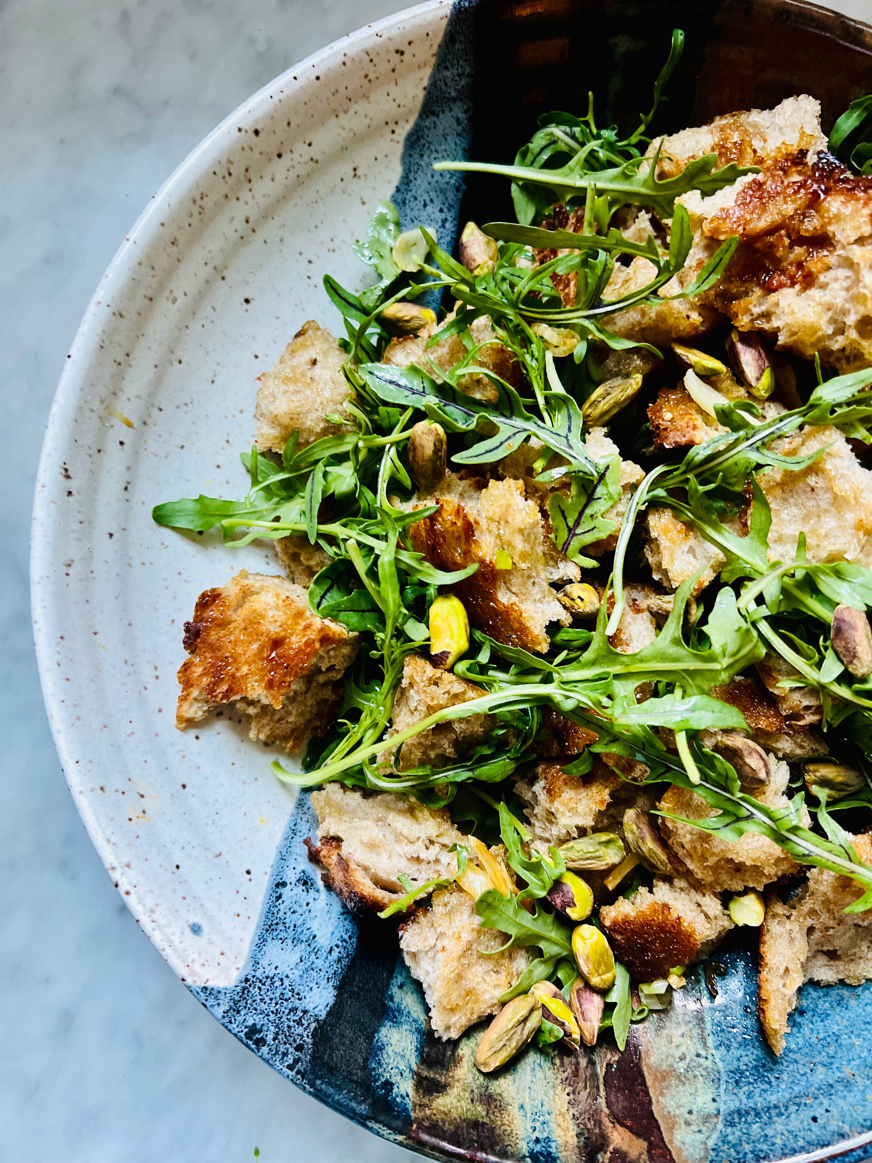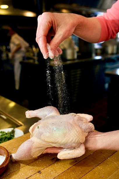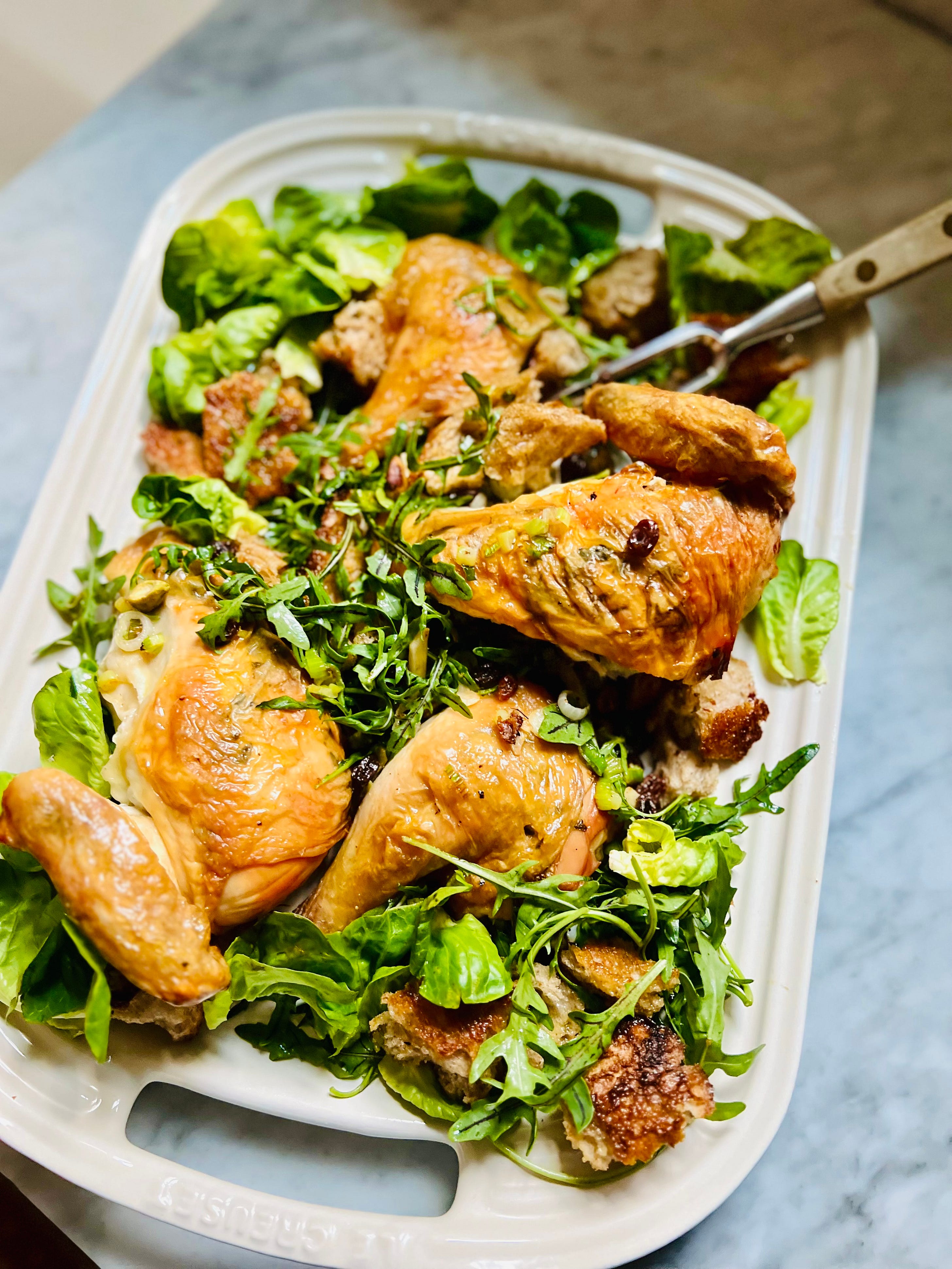 THE RECIPE: Judy Rodgers’ Zuni Roast Chicken with Bread SaladMy recipe is an adaptation of Judy Rodgers’ famous chicken. If you love this recipe, you should find a copy of her book so you can read the recipe in her own words. I made a few, tiny shortcuts here and there. I know she doesn’t want sourdough bread in the bread salad—I’m guessing because it’s so strongly flavored—but that was all I could find, and we loved it! Soaked in red wine vinegar, the currants are the star. I doubled the amount in her recipe, but I wasn’t going to pay the price for Chinese pine nuts, so I substituted pistachios, which were lovely. If you can find real Italian pignoli and they don’t cost an arm and a leg, do it! And lastly, I was worried my chicken was too large for her specifications—about 3 1/2 pounds. But I followed the directions, and the skin crisped and the chicken was tender and cooked through in 1 hour, 15 minutes. I did remove the backbone before roasting, which speeds the process and allows the chicken to roast skin-side up the entire time in a cast iron skillet. Makes 4 servings A small chicken (2 3/4 to 3 1/2 pounds) 1 1/2 tablespoons kosher salt (use 3/4 teaspoon per pound) Sprigs of rosemary, thyme, or fresh sage 12 to 16 ounces open-crumbed, chewy, peasant style bread, crusts removed Extra-virgin olive oil for brushing the bread (2 to 3 tablespoons) Vinaigrette: 1 1/2 tablespoons white wine vinegar 1/4 cup extra-virgin olive oil Salt and pepper to taste Currants: 2 tablespoons currants 2 teaspoons red wine vinegar 2 tablespoons warm water 2 tablespoons pine nuts or pistachios 2 to 3 cloves garlic, peeled and thinly sliced 1/4 cup sliced green onions (white and green parts) 1 tablespoon olive oil 1 to 2 tablespoons tap water 4 cups lettuce leaves (Boston, Bibb, Romaine, arugula) Freshly ground black pepper