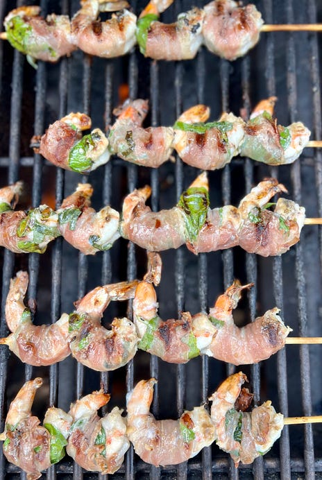 Thank you for reading Between the Layers! Please enjoy and share this free post with your friends. Summer Begs for Silver Palate Shrimp - No. 298A throwback favorite recipe + Baking in the American South tour updates + a Publishers Weekly starred review!EACH TIME I’VE MOVED, I’VE PARTED with cookbooks and later regretted it. Case in point—Moosewood. Should have never sold that one at the Atlanta garage sale in 1993. But I did, however, hang onto my Silver Palate cookbooks—the first book published in 1982 and the follow-up two years later. Both were beloved manuals for first attempts at fancy dinner parties, and their dirty pages are now stained with cocoa, raspberry vinegar, and drops of pesto. Julee Rosso (the advertising executive) and Sheila Lukins (the caterer), were the co-authors and co-owners of the Silver Palate gourmet store on New York’s Upper West Side. The shop had opened in 1977 to feed busy professionals more global flavors. Patricia Wells, writing in The New York Times, called it a “tiny food shop with big ideas.’’ And Christine Muhlke wrote in The New York Times Magazine in 2007, that ‘’Silver Palate was born out of the women’s movement.’’ Its tarragon chicken salad, ratatouille, salmon mousse, and Chicken Marbella filled the serving dishes of working women who yearned to entertain but didn’t have time to cook. What I find fascinating is the Silver Palate store didn’t have space for a kitchen. So Sheila’s mother baked the signature carrot cakes in her home and drove them to the shop on Columbus and 73rd. Most of the food was prepared in Sheila’s apartment nearby in The Dakota. “John Lennon would come in and sit by the breadbasket and chat,” Rosso remembers of Sheila’s famous neighbor. “One night, I was struggling in the snow to bring some beef Bourguignon from Sheila’s to the shop, and he helped me carry it. He hung out to chat and then bought it and carried it back home.” Their books flew off the shelves in those pre-Amazon days. There was a 10th anniversary edition and then a 25th. In 1988, Julee and Sheila shut the doors and sold the Silver Palate. Julee returned to her native Michigan to run the Wickwood Inn in Saugatuck, and she published two more cookbooks. Sheila, who everyone knew was the cook of the pair, went on to write three more cookbooks and was the food editor of Parade magazine. The two had a public falling out in 1991, however, after Julee wrote in her newsletter of Sheila’s failing health. Sheila died of brain cancer in 2009. She was 66. Throwback Thursday: My favorite Silver Palate shrimpObviously, everyone’s favorite Silver Palate recipe is Chicken Marbella with its irresistible prune, olive, brown sugar, and wine-soaked chicken. But there are so many other great recipes in the Silver Palate legacy. For me, a favorite is the grilled shrimp wrapped in basil and prosciutto from the second book, the Good Times cookbook. I can’t recall the first time I made this recipe because it’s always been in the back of my mind and on our summer menus. Sometimes it’s paired with pasta and other times with grits or a corn salad. What about you? What’s your favorite Silver Palate recipe?The method is so simple that you really don’t need a recipe. You don’t even need to marinate the shrimp before you grill them. But if you make this recipe the way Sheila and Julee first intended, which is what I did this week, then go ahead and soak the shrimp first in white wine, olive oil, lemon juice and a little Dijon mustard. I added some garlic, too. The recipe calls for at least three hours of marinating time, and I think that’s about right. Marinate in the morning, chill, then cook later that afternoon. Or, in a pinch, give the shrimp about 30 minutes to soak up the marinade, which keeps them moist on the hot grill. And to use the leftover marinade, I sliced a zucchini lengthwise, and dragged the slices through it before grilling and piling onto the platter with the shrimp. What is it about summer that changes the way the way we eat, sleep, and spend our free time?No sense in fighting summer. It rolls around each year, and for those of us in the northern hemisphere, the trick to loving it is just to accept the heat. Revel in the tomatoes, peaches, blueberries, and basil. Fire up the grill, don short sleeves with something cool to sip, play favorite tunes with favorite people, and ignore the mosquitoes. (Seriously, the bugs have been horrid this year!) So bad we’ve sprayed ourselves with all brands of insect repellant—the favorite so far is Murphy’s. It’s made of lemon eucalyptus oil and smells nicely botanical. Not realizing its pungency on a recent vacation, my granddaughter and I were walking a path through wet woods and I kept smelling something wonderfully lemony and we looked around for exotic blooms until I realized the smell was coming from our arms and legs lacquered in Murphy’s. And we didn’t have one single mosquito or tick bite! I hope you make it through the rest of summer mosquito-free, and I hope you have time to grill these yummy shrimp! - xo, Anne August means back to school, and it’s when cookbook reviews start coming in.I was thrilled that Garden & Gun magazine gave such favorable comments to Baking in the American South. And this week, a Publisher’s Weekly starred review said…’’Byrn provides an encyclopedia of Southern baked goods in this masterful and extensive collection encompassing the region’s sweet and savory offerings… This is a treasure trove.” After three years researching, interviewing, traveling, writing, testing recipes, and styling photos, these are incredibly welcome words. Baking in the American South Book Tour! Last week, for paid subscribers, I shared notes about the Nashville, Athens, Atlanta, and Chattanooga parts of my book tour. This week I’m sharing some details of another leg of my journey after publication day on Sept. 3: Memphis - I’ll be at 