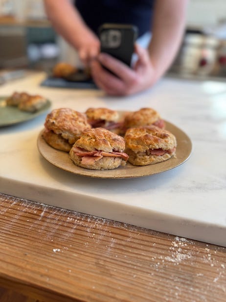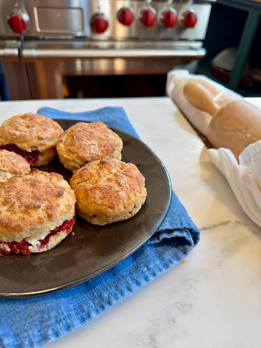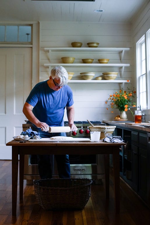 Thank you for reading Between the Layers! Please enjoy and share this free post with your friends. CHOCOLATE CAKE DIDN’T TAKE ME to Alabama, but chocolate cake was what I thought about all the way home. After a book signing in Montgomery last week, I drove west to Marion through historic Selma, the once-bustling manufacturing hub nestled on the high chalk banks of the Alabama River, the setting of an 1865 battle in the late days of the Civil War, and a century later, where civil rights marchers crossed its Edmund Pettus Bridge en route to Montgomery. Then I drove north through pine-thick forests where the soil turns from poor red clay into the rich dark dirt of the Black Belt. And while today ‘’Black Belt’’ is a term for a place with a majority Black population, in the 1820s and 30s, it was all about the dark fertile soil that grew cotton and made its landowners rich. The directions from Chef Scott Peacock to a house called Reverie in the town of Marion were simple enough. Locate the square. Turn left before the courthouse. On the right will be a white columned home. Pull through the gate to the back. Don’t block the driveway. Follow the path to the front door, which will open at 10. What he didn’t say was this five-bedroom 1858 Greek Revival home with four stout Doric columns and a widow’s walk on top has a boxwood knot garden, a grape arbor, a smoke house, hot pink camellias in bloom around its perimeter, and an orange tabby cat with a triumphant purr. When Reverie was built in the mid-19th Century, Marion was like other Deep South places situated near rail lines with an ample supply of enslaved help to work the cotton fields and fry the chicken. The money from cotton brought banks, architects, churches, and schools and later, segregation, violence, and the civil rights movement. Jean Childs Young (wife of Atlanta mayor and UN ambassador Andrew Young) and Coretta Scott King were both born here. Coretta Scott graduated as valedictorian from Lincoln Normal School in 1945. She married the Rev. Martin Luther King, Jr. on the front lawn of her mother's Marion home in 1953. For going on six years, Scott Peacock has been teaching people how to bake biscuits in Reverie’s kitchen. I met Scott when he was chef at the Georgia governor’s mansion in the mid-1980s. And then he found fame for his refined style of Southern cooking at Watershed restaurant in Decatur, outside Atlanta, and he would win the James Beard Award for Best Chef: Southeast in 2007. Scott became close friends with the Virginia chef and author Edna Lewis, and together they would write The Gift of Southern Cooking, published in 2003. After Miss Lewis died three years later, Scott reconnected with his Alabama roots. He had been born and raised in Hartford, south of Marion and Selma in what’s known as the Wiregrass region situated near the Florida border. His maternal great-grandmother Stewart ran a tea room there. Scott traveled to Marion to connect with the 107-year-old Eloise Hause, who had known his great-grandmother, and he hoped she might remember the tea room, which she did not. He spoke also with Ollie Glass, a 100-year-old Black woman in Hartford, who had cooked the foods of this region all her life. He interviewed the local writer Mary Ward Brown, then 92, and was enriched by her stories of old Alabama food. Charmed by this history and Marion’s slower pace, Scott bought an 1835-era home that needed love. He connected with Hunter Lewis, a Charlottesville investor and philanthropist who had restored Reverie and was eager for others to appreciate its beauty. In 2019, Scott posted a picture of biscuits on Instagram with the announcement that he was inviting small groups into Reverie’s kitchen to spend four to five hours making biscuits. Word spread like an Alabama pine fire. When I showed up at Scott’s doorstep, I was the 1,744th person wanting to learn how the perfect alchemy of heirloom flour, high oven heat, homemade baking powder, cold French butter, and whole buttermilk made mighty fine biscuits. This was MLK’s birthday and inauguration day, and I couldn’t think of a better place to soak in the ironies of this moment than to be in Reverie’s warm kitchen. My fellow Biscuiteers drove in from nearby Tuscaloosa and Huntsville, as well as Greensboro, North Carolina. We roamed the house like school kids on a sleepover, traipsing up and down its suspended staircase, gazing at period antiques, and searching for a window pane where a bride etched her name with her diamond engagement ring. John Kessler once wrote in Garden & Gun that visiting Scott’s kitchen isn’t just about biscuits but more like ‘’a moment of Alabama Zen.’’ For the first hour and a half we sat in the parlor listening to the now silver-haired but still cherub-faced chef talk about soil, cotton, and the town’s legacy of slavery. He spoke about how this grand place was once built as a spec home by cotton planters, and I couldn’t shake the feeling that this ‘’experience’’ for us was also a healing session for Scott. His Grandmother Peacock had made her simple biscuits with Snowdrift shortening, less expensive than Crisco, Scott says. To him, her biscuits were never good enough. They tasted of ‘’nothing but hardship and difficulty.’’ Even as a boy he noticed poor people’s biscuits like hers didn’t have layers like those fancy store-bought Pillsbury biscuits. But there’s a democracy to biscuits, he says, pricking the dough with a coin silver fork gifted from a Biscuiteer. Biscuits might be made from staple ingredients, and they might be baked in a humble kitchen or an antebellum mansion, but ‘’the hand is the magic.’’ ‘’No one can duplicate our hands.’’ Scott reaches his hand into the fridge for Ball quart-size jars of premeasured heirloom flour. It’s a mix of White Lammas and Red May, custom-ordered from Anson Mills in South Carolina. Then, he sifts what he calls ‘’morally sup