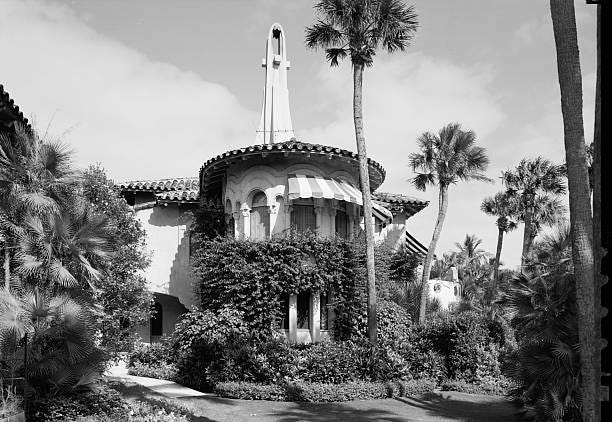 And what a home it was, nestled in northwest Washington D.C., on 25 acres with exquisite gardens and mansion rooms filled with souvenirs from MMP’s travels and lifelong love of French decorative and Russian imperial art. As I stepped into the Uber taking me back to the airport, I wondered what room or garden would fascinate those girls. The pond frogs spewing water like garden hoses from their mouths, a sweet cemetery dedicated to all the beloved dogs of MMP’s life, little bridges and stepping stones crossing ponds in a Japanese garden, or the diamond-bedazzled Faberge eggs surrounded by security glass. Maybe not the sterile kitchen-meets-chemistry lab with its miles of stainless steel countertops and all the mixers and grinders needed to make enough food to entertain crowds. The cozy dining room table was once used on her yacht, and the ivy china came from her palatial Palm Beach, Florida residence we all know the name of now—Mar-a-Lago, from the Spanish meaning ‘’sea to lake’’ because it touches the Atlantic Ocean on the east and the Lake Worth Lagoon on the west. The words ‘’Mar-a-Lago’’ snapped me out of my Gilded Age dream and back into reality. Maybe the reason so many of us tour grand mansions and gardens is that for a hour or so we’re not in our world. We’re not making a grocery list or returning emails. We’re standing in an heiress’s pink bedroom and see the small room to the left where she gets her hair styled each morning. We’re walking past rows of lush crimson azaleas and into hidden garden rooms with pools, benches, and inscriptions to ponder. When MMP died in 1973, Mar-a-Lago was bequeathed to the National Park Service for the American people. She had hoped the beach home might be used for state visits or as a winter White House. But seven years later, realizing the property was difficult to secure and too expensive to maintain, Congress returned the gift to the Post Foundation, which sold it to Donald Trump in 1985.