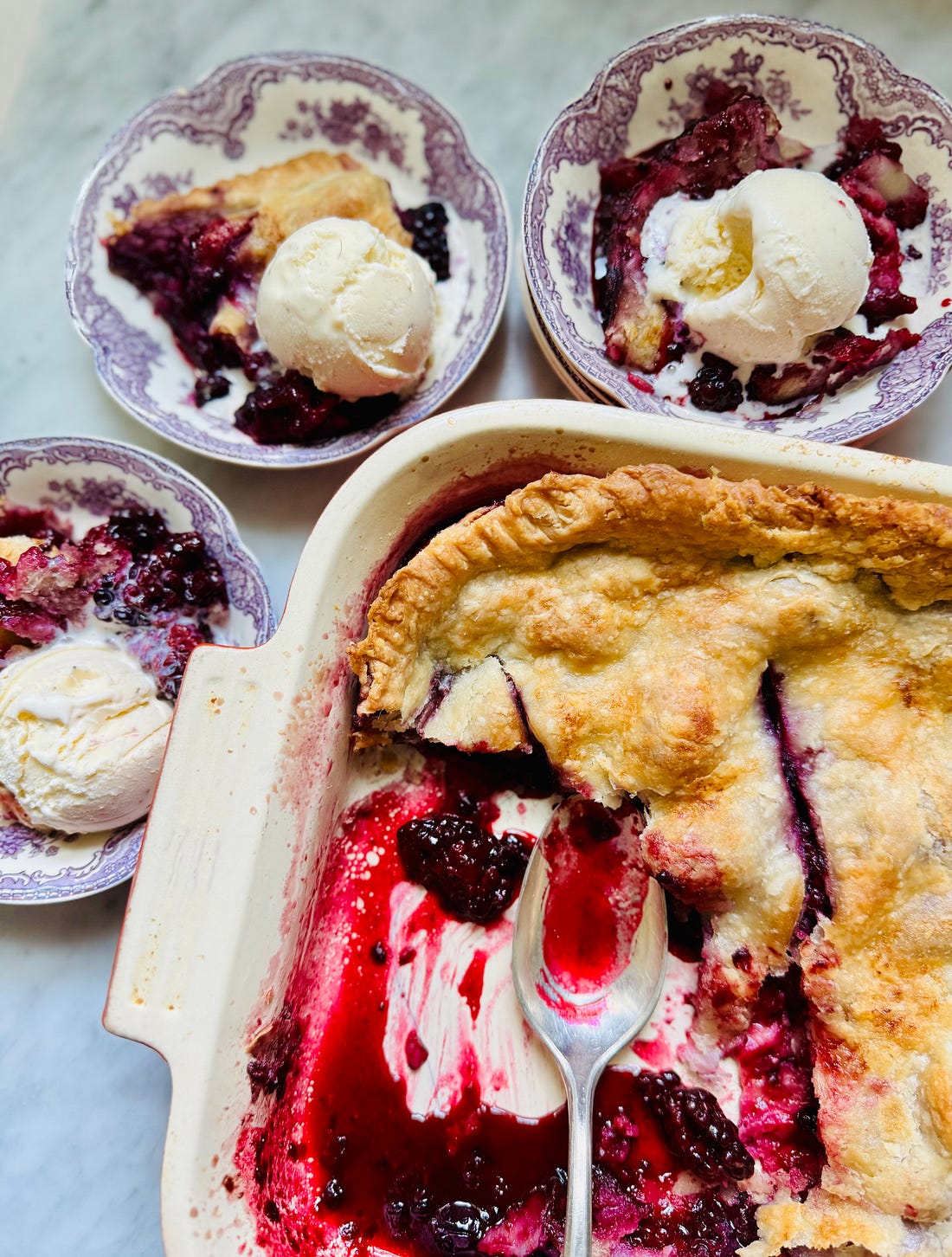 I OPENED UP A CAN OF PEACHES last week when I wrote about peach cobbler Texas-style. It was wonderful hearing from cooks from all sorts of places as to what they call cobbler. It seems that cobbler is personal. Today, I’d like to back up just a bit and tell you about the peach cobbler of my dreams and how I found it. And then I’ll step into the world of blackberry cobbler with an Edna Lewis recipe made for July 4th. First, the best peach cobbler I’ve ever tasted is definitely the 1920s Kentucky recipe I wrote about in Baking in the American South. It comes from a Scott County schoolteacher named Mary Bradley Moss and was shared in the African American Heritage Center’s Heritage Cookbook in 1998. I found the cookbook when I was in Tuscaloosa researching the excellent collection of African American cookbooks at the University of Alabama. To make it the best peach cobbler, you need ripe peaches with plenty of juice, a high oven heat, and a dark pan for lots of flavorful caramelization. What I learned about peaches is that they grew in a lot of places across America. Needing up to 800 chill hours (between 32 and 45ºF during their dormant period, depending on the variety) per year, plus loads of sunshine, they are quite specific in their requirements. I hear Colorado today has some amazing peaches? We all know about California, the largest producer. And yes, we know how beloved the peach and its cobbler are in South Carolina, the number two U.S. producer, well ahead of the Peach State itself (Georgia) with its Peachtree Streets, peach queens, and the Peachtree Road Race this Friday morning. I venture to say everyone in America loves peaches in the summer and has had access to them at some point in their lives for cobblers, ice cream, and such. I would also venture to say that peach cobbler is precious because it has nothing to give us but pleasure. In fact, if we are to survive this turbulent summer with record heat in both the natural and political atmospheres, I say we had better set the ovens for cobbler right now. Our ancestors knew cobbler—peach, blackberry, blueberry, cherry—was a smart way to use up local fruit in a most irresistible fashion. But I was hungry for blackberry cobbler, so I turned to a method that Virginia chef and author Edna Lewis knew and wrote about. She and Alabama chef Scott Peacock share the recipe in their 2003 book, The Gift of Southern Cooking. I bought about 5 cups of fat, fresh, sweet blackberries from the local farm stand and quite possibly another 1 cup of tart, wild blackberries were growing at the back of my garden. I also had about 2 cups of fresh blueberries in the fridge, and I was thinking how lovely they would be mixed and mingled together underneath a blanket of buttery crust... Subscribe to Anne Byrn: Between the Layers to unlock the rest.Become a paying subscriber of Anne Byrn: Between the Layers to get access to this post and other subscriber-only content. A subscription gets you: