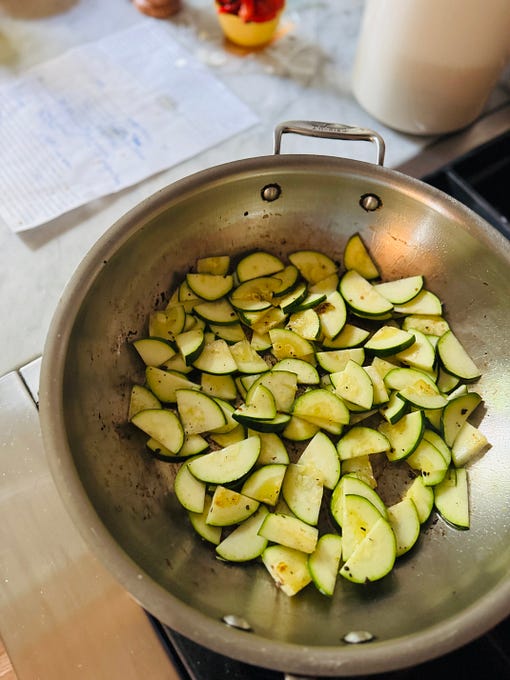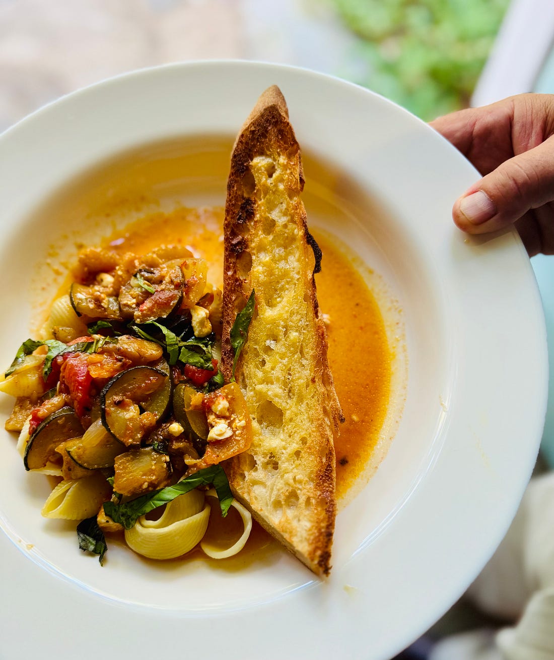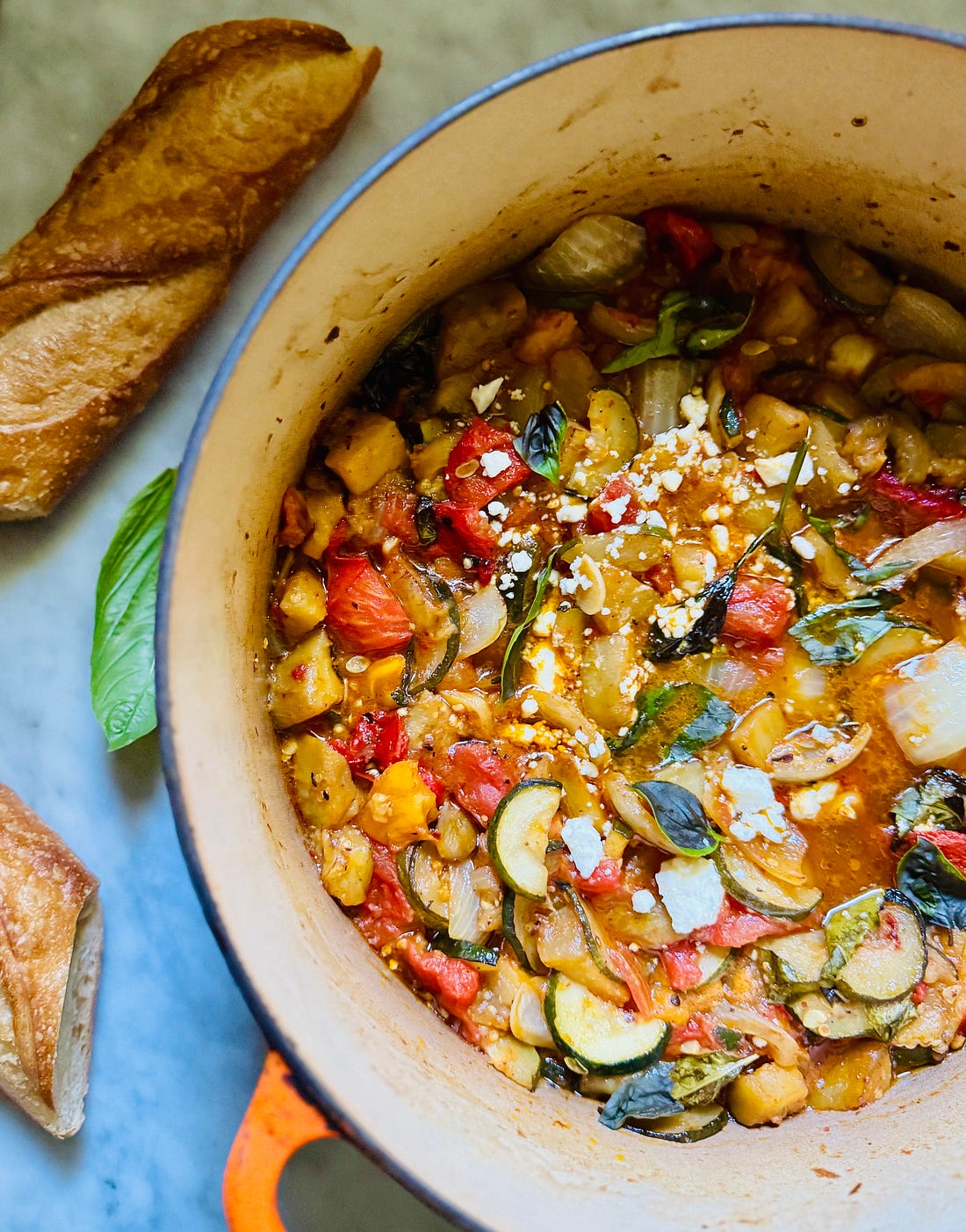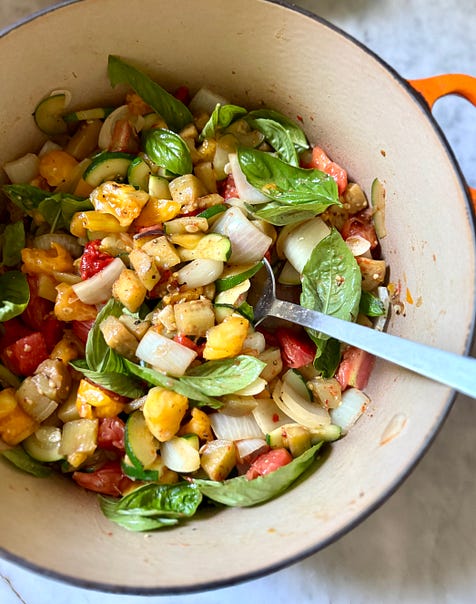 THERE’S A PHILOSOPHICAL STATEMENT often linked to Aristotle saying the whole is more than the sum of its parts. When I hear this, I think of ratatouille. Right? Isn’t a warm pan of ratatouille—the French eggplant, zucchini, and tomato stew originating in Provence—much more interesting than a basket of vegetables? You know and I know it’s the process of cooking the veg in olive oil with garlic, salt, pepper, and loads of fresh basil that makes it scrumptious. The time it takes to saute, stir, and lightly roast is well spent because ratatouille is one of my favorite summer foods. And it is part two of my impromptu Tomato Diaries here at Between the Layers. I sat down at the kitchen table a few weeks ago wondering how to express my love for the summer tomato, and this mini series bubbled up. The first segment last week for paid subscribers was about my obsession with growing tomatoes and the lengths I will go to in researching and protecting my crop. I shared how to roast them and a garlicky summer sauce to pour over tomatoes. A conversation 20 years ago with Middle Tennessee farmer Tana Comer turned how I had looked at ratatouille on its head.Tana supplied our family with endless organic veggies for so many summers as we were the recipients of one of her first CSA boxes. She shared recipes when we met her in a church parking lot each Wednesday afternoon to pick up our box. One recipe I will never forget was her way to make ratatouille. The secret, said Tana, is to saute each vegetable separately, and then they go into the oven together to “roast.” Tana said if you toss all the veg into the pan at the same time, they don’t preserve their own unique flavors. They just stew and what results tastes like boiled vegetables. Sadly, this is how most ratatouille is made. But once you make it Tana’s way, with a skillet and a baking dish bound for the oven, you will never go back. I pulled out my copy of Julia Child’s The French Chef Cookbook (1961), and on page 57 was her Ratatouille recipe. (It’s also in her Mastering the Art of French Cooking, Volume 1.) She also advises to cook the vegetables separately and then ‘’everything is combined for a brief communal simmer.’’ This is one of those classic Julia recipes—not as arduous as the long ones that take all afternoon to assemble and call for step by step until the sink is piled with dishes and guests are coming in an hour for dinner and you look like hell. But you grab a quick shower and change of clothes, dim the lights, pour some wine, and everyone gathers around your feast with oohs and aahs, then you taste the food and say to yourself, this is so good! The reason why may be your genius cooking or the steps. Julia’s steps. Tana’s steps. Simply put, there is more deliciousness when you layer in seasonings and take your time. In the case of ratatouille, it’s more delicious step by step because the eggplant has a chance to caramelize in the skillet and seal in its juices. Ditto the zucchini. The onions and peppers bathe together in the oil, and the tomatoes simmer with garlic because they were birth partners from the get-go. Then, Julia tells you to simmer. But I agree with Tana that you should roast ratatouille to doneness. Where were you in 1975?I’ve been wanting to write about a 1975 recipe like ratatouille. Ever since this year was ushered in, I’ve thought about songs and recipes that date back 50 years. Shining Star from Earth Wind and Fire. One of these Nights by the Eagles. Bohemian Rhapsody from Queen. And zucchini. In 1975 it was coming into American kitchens. Many other things were happening in America in 1975. The Watergate scandal had been exposed, Nixon had resigned, and his vice-president Gerald Ford was now president. The Fall of Saigon marked the end of the Vietnam War. Bill Gates and Paul Allen were founding Microsoft. Saturday Night Live debuted, and the vegetarian Bible called The Moosewood Cookbook, first self-published in 1974, was on store shelves. And that’s how I was introduced to ratatouille. I would make it a decade later at La Varenne cooking school in Paris and years after that, from Julia’s cookbook. But Tana’s recipe is the only one I want now. It just tastes better. We serve it alongside fish off the grill or shower it with feta and spoon it onto crusty baguettes. (This summer I’ve made such a big pan that I’m freezing some, too. Not sure how that will turn out, but come October, I think it might be welcome.) Tana’s ratatouille, now my ratatouille, brings together fresh and bold flavors and especially summer tomatoes. These flavors could stand on their own, but together they are stronger. In ratatouille and in life, the whole is grander than the sum of its parts, or at least that’s my interpretation of Aristotle. Fifty years from now, I hope there will still be great recipes to remember. They allow us to time travel, reflect, think about more than just the meal. Philosophically speaking, they might help us assess from where we came and where we want to go. - xo, Anne P.S. Happy Birthday month, Julia! (And all of us with August birthdays!) She was born August 15, 1912 and died in 2004 just shy of her 92nd birthday. To read more about Julia Child’s ratatouille, here’s a treat. In honor of her 100th birthday in 2012, friends gathered to share delightful stories about her impact on the Cambridge dinner party scene. The Greek philosopher Aristotle wrote 2,375 years ago. It’s no wonder he is often misquoted today! It is correct he wrote “the whole is something besides the parts” and “the whole is not the same as the sum of its parts.” If you’ve got time to spare and like to deep think, here’s an interesting link. THE RECIPE: Tana’s Roasted RatatouilleIf you toss all the veg into the pan at the same time, they don’t preserve their own unique flavors. They just stew together and what results tastes like boiled vegetables. And sadly, this is how much 