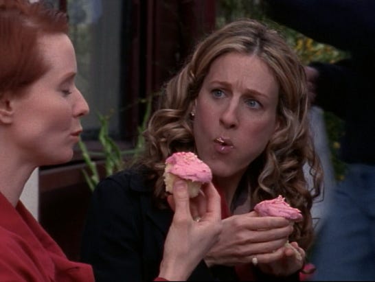 I CAN GUESS WHAT I WAS DOING when Carrie (Sarah Jessica Parker) and Miranda (Cynthia Nixon) ate pink-frosted cupcakes on a bench outside New York City’s Magnolia Bakery 25 years ago. I was probably plugging in a Crockpot to cook chicken with taco seasoning for supper. Or doing laundry, making sure someone was practicing piano or getting a bath, and scheduling tomorrow’s business call in a sliver of free time. I had three children 10 and under plus two older parents living in my house, a dog to walk, a marriage, and a bestselling book that led to frequent appearances on QVC and Good Morning America, thus my ability on the random business trip to watch Sex and the City while ordering room service. The show would never have met the PG standards of home. Over cupcakes and dressed in stylish Jimmy Choos, these girlfriends revealed secrets—Carrie had a crush!—as they licked pink frosting and peeled back the paper liners of their cupcakes to tease the buttery vanilla cake within. To me, the sexiest part of the show was the cupcake. If ours was the so-called “sandwich” generation, with lives situated between obligations to parents as well as children, then in 2000 my life was an all-you-can-eat-drag-it-through-the-garden kind of sandwich. I knew my day to day wasn’t anything close to the Sex and the City gals, so perhaps that’s the delicious pleasure I felt when allowed in on their conversations. I’d never spend that much for a pair of shoes, but I would bake those cupcakes at home. I even wrote a book about cupcakes. And eventually I visited the famed Magnolia Bakery on Bleecker Street in the West Village, which was opened in 1996 by Jennifer Appel and Allysa Torey. They began making cupcakes with leftover cake batter, and those cupcakes with their signature flat swirl of icing with a deep crevasse would become wildly popular. Appel left the business to start her own bakery, and Torey sold to entrepreneur Steve Abrams in 2006, who then sold to private equity about four years ago. Still very much a New York thing and super-popular with tourists, there are 10 Magnolias in the city, plus one in LA, one in Chicago, and seven internationally. Cupcakes have such an interesting story. They are rooted in World War II America when women would bake small cakes and bring them to their factory jobs to share with co-workers. They go back even further to a time when a ‘’cup cake’’ was assembled with a cup of this and that and baked in wood ovens in what were known as “gem” pans. But believe me, neither of these hardscrabble scenarios produced the kind of fanciful cupcake Carrie and Miranda indulged in. Once Magnolia Bakery shot to stardom, it created a Carrie Cupcake, which is still on the menu—vanilla cake, pale pink buttercream, and sugar daisy on top. It’s not surprising we became so enamored with cupcakes. The timing was right. We hadn’t yet experienced the horrors of 9/11. We could walk through airport security with shoes on back then, and with a full water bottle, too. A year earlier we had been shocked by the Columbine High School massacre in April 1999, but surely as cupcakes soared in popularity we were naive as to what tragedies lay ahead. And now, writing this ode to cupcakes, it’s clear that even cupcakes can’t sugarcoat the frightening and divisive time in which we live in America.
