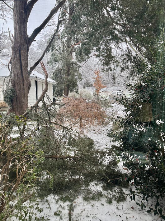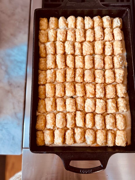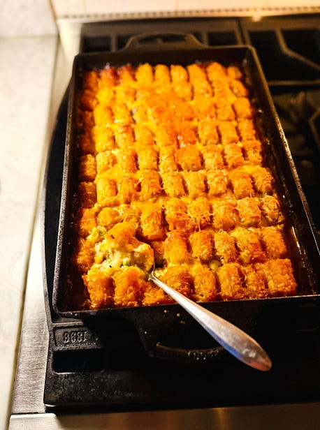 I hope you enjoy this issue of Between the Layers! Share it with your friends. A Southern Tribute to Minnesota Hotdish - No. 378With crispy Tater Tots on top, it’s comfy soul food for an icy, turbulent timeSINCE WE ARE FOOD-LOVING PEOPLE here at Between the Layers, I’ll share a recent Threads comment from bestselling cookbook author Sarah Keifer. She’s the one who created the viral pan-banging chocolate chip cookie recipe. And she’s also a Minneapolis resident who posted that she finds it hard to write about recipes when her town feels like a war zone. It reminds me of how after Nashville’s March 2023 Covenant School shootings, I couldn’t write about strawberry cake and instead told you what was in my heart at that moment. I lost paid subscribers being vocal about the tragedy and gun laws, but we writers know speaking up comes with a cost. Sarah felt Minneapolis isn’t being supported by the rest of the country and said, “People don’t want to think about what doesn’t affect them.” At the time, I knew she was right. And I still know she’s right, even after an ice storm slammed into my town 10 days ago. From the dangling power lines and trees snapped in half like pencils, Nashville looks like a war zone, too. I am still without power. Hundreds of thousands of people in middle Tennessee lost power due to a combination of unprecedented weather—the perfect storm, exponential growth of Nashville as the “it” city, and what feels like ill preparedness on the part of our local utility, Nashville Electric Service (NES). All I can think about right now is that I am cold. I am uncomfortable. I am hopeful NES will fix my busted transformer soon. But if you weren’t in the path of this storm, you probably don’t stress about it. So my reply to Sarah is two-fold: