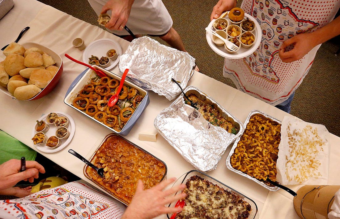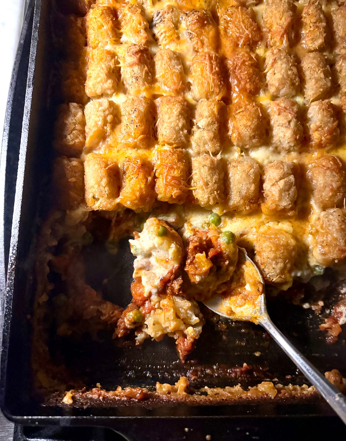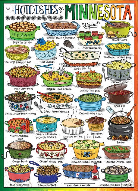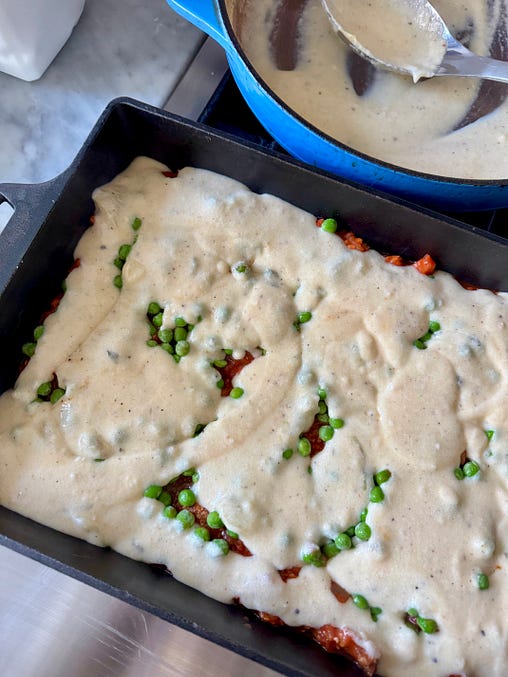 Food is the equalizerBaking hotdish let me to forget discomfort and marvel in a new recipe. It’s good solid food and welcome on a cold evening. I put my own spin on the recipe, making a jazzed-up red sauce with ground turkey, a from-scratch cheese sauce with the block of cheddar I needed to use, what was left of my frozen peas, and all but nine Tater Tots from a two-pound bag. Eating hot bowlfuls in front of the fireplace was a kind of empathic experience that should be basic training for ICE, Pam Bondi, Kristi Noem, and all of the White House. I hope Minneapolis knows that even though we can’t join them in person, we admire their strength. We can make their recipe and open up our hearts. Enjoy the hotdish and keep warm, - xo, Anne P.S. Many thanks to Between the Layers paid subscriber Karen S of Minneapolis for help with this post! THE RECIPE: Minnesota Hotdish from a Southern KitchenTo come up with this cozy-as-a-sweater recipe, I researched hotdish recipes. While many of the gooey, creamy sort of recipes called for a can of cream of mushroom soup—and I was raised on the stuff so am not going to be a canned soup snob—I wanted the sauce from scratch. So I read Molly Yeh’s post about hotdish and scanned her recipe. What I liked was the homemade sauce and the use of frozen peas, but it looked too meaty and bland. We like a bit of spice in the South. We were raised on homemade creamy sauces and gravies and know how to pull them together and season for the occasion. The fresh nutmeg added just the right touch. This essentially was the sauce my mom made to pour over freshly steamed cauliflower. The layering of Tater Tots was so fun. A two-pound bag was perfect to top a big 13-by 9-inch pan of hotdish. This feeds eight really hungry people at dinner or 12 at a potluck. It’s an adaptable sort of recipe—you can use the ground turkey or opt for beef or go meatless, which would be fabulous. Substitute 1 pound of Baby Bella mushrooms, chopped as if to resemble the ground turkey. With the frozen peas in the casserole, you’ve covered the bases, but if you want to round out the meal, I’d suggest a green salad. Or Jell-O, which would be very Minnesotan. Makes 8 to 12 servings (or cut the recipe in half and assemble in a 2-quart baking pan)