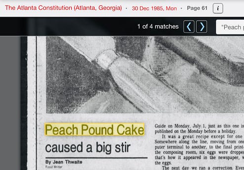 I hope you enjoy reading this issue of Between the Layers! For more recipes, consider becoming a Paid Subscriber. My Love/Hate for Peach Pound Cake - No. 142How one recipe follows me through life & why I want you to bake it.HAVE YOU EVER HAD A FRIEND, A PET, a boss, even someone in your own family, who in spite of being absolutely charming was just plain evil? Out to get you? As soon as you recommend them, go to bat for them, include them, they disappoint you by actions, words, but more to the point, make you look like a fool again? Don’t worry, I’m not going to cue Reba to start singing cheatin’ heart songs. I’ll tell you what this has to do with pound cake… Peach Pound Cake. It is the worst/best friend of a recipe I’ve ever had. And I have written about it for 37 years. Peach Pound Cake caused a big stir. The Atlanta Constitution, Dec. 30, 1985.It surely did! I created this cake in 1985 with early-season Alabama peaches, honestly too underripe and lackluster to warrant baking with, but they baked into a beautiful cake. So I shared the recipe in the newspaper that summer. Yet, due to my error—or it could have been the layout team as newspaper pages were literally cut and pasted back then—the six eggs were omitted. So we ran a correction the next day. Thus, the big stir… And readers called and wrote to tell us—before emails obviously—that this cake was either the most delicious cake or the most horrid they had baked. One lady, following the recipe with the missing eggs, guessed it was six, baked the cake, and served it to all her friends. She was at the beach and wasn’t even using her faithful home oven and it worked. Others said the cake was heavy, wet, a little gummy on top. But it ended up being the most popular recipe of the year so people kept talking about it. I baked that cake again later in the summer with ripe freestone peaches.And yes, this time they were from Georgia. And I made sure to finely chop and drain them well before adding them to the batter. I even reduced the sugar in the cake to make it less tender, wondering if too much sugar was causing the cake to not have the structure it needed to support the peaches. I reduced the sour cream a bit, too. In short, I pulled my hair out. And the cake worked. It was good. It’s always been good, just problematic. I had shelved any desire to reconnect with this pound cake until earlier this year when I was selecting pound cake recipes to go in my new book. I missed the Peach Pound Cake. But did I want to go down that road again? To make matters worse, Kyle Tibbs Jones, my friend at Bitter Southerner, called and said they were publishing a book on Peaches and asked if I’d like to contribute a recipe. Sean Brock was sharing his pickled peaches. I thought for a minute which recipes she’d like best. ‘’Well, there are two recipes I could share,’’ I said. “One is a pound cake and the other is peach preserves that my aunt Mary Jo used to cook in the sun.’’ I was sure she was going to pick those preserves. ‘’I’ll take the pound cake,’’ Kyle replied. And so I pulled out the pound cake recipe that weekend and baked it. But I didn’t bake it exactly like I had before. I scrutinized the recipe again, trying to make up for those juicy peaches—of course they were going to be juicy, it was summer for goodness sakes! And the large eggs looked really large. Do you know what I mean? Where are these eggs coming from, a dinosaur? So I baked the cake with five eggs and folded those drained peaches in by hand. It was like waiting for disaster. But it wasn’t. It worked. Yet, I confessed to Kyle that I didn’t feel comfortable sharing this recipe because it was so all over the place. Much too needy depending on the juiciness and ripeness of the peaches, not to mention the flour, size of the eggs, the pan and oven. Plus, would I have to continue to field questions from Bitter Southerner readers about this cake? She gracefully accepted the preserves. ... Subscribe to Anne Byrn: Between the Layers to read the rest.Become a paying subscriber of Anne Byrn: Between the Layers to get access to this postand other subscriber-only content. A subscription gets you: