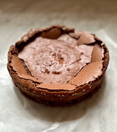 I appreciate your reading Between the Layers! This post is paywalled, so if you find it interesting and want to read the full post and get the recipe, and help me keep this newsletter going, consider becoming a Paid Subscriber to support it. Thank you! A French Mother’s Flourless Chocolate Cake - No. 183Fortunately, no chocolate-sprayed moss. Just a simple, sublime, intensely chocolate, and little bit reckless cake to bake. Plus 5 things to know.FLOURLESS CHOCOLATE CAKE is such a rule breaker. It disregards what you’ve been told about baking a cake. True to its name, it has no flour. Sometimes ground almonds, and often bread crumbs or a smidgen of cornstarch are folded into recipes, but not in the cake I share today. It is just chocolate, butter, sugar, and eggs. And I apologize that it calls for nine eggs, what with eggs so expensive. More on that next week. But if you consider this cake a special occasion cake (and it is a fabulous Valentine’s cake or a dinner party cake), then maybe you can justify the expense. I figured it set me back about $8, for the eggs, the higher price of chocolate, and the sugar and butter I buy in bulk at Costco. In December, I shared Dione Lucas’s recipe for a flourless chocolate cake roll. And true confession time, I’m crazy about all things flourless and chocolate. I’m not sure if it’s that rich, near-raw blast of chocolate I’m after or the genius nature in which this classic cake is made. Wet, rich, and wickedToday’s recipe is from French chef Michel Guerard’s book, Michel Guerard’s Cuisine for Home Cooks (1984). I was cleaning up the office and clearing off bookshelves when I eyed this book from another place in time. Back when American gourmets were fixated on all things nouvelle cuisine, I was right in the middle of them, writing about food in Atlanta as it prepared to boom. A lighter style of cooking emerged in France and elsewhere in the mid-1970s with less sauce on the plate, more seasonal vegetables, and food that was minimally cooked versus stewed and reheated. Flour was removed from savory sauces and in its place were natural juices—known as ‘’jus.’’ On dessert plates, the sauce was light and fresh with raspberries and other fruits that had been pureed into a vivid coulis. Remember coulis? So sans flour, these flourless cakes fit in nicely. And they were everywhere. Chocolate, by far, was the most popular. Author and dessert-maven Maida Heatter said flourless chocolate cake was the ‘’most sensuous,’’ dessert she knew. It was, in her words, ‘’wet, rich, wicked.’’ And she should know. Her book on chocolate is filled with variations of them. You want it to look this way. Flourless chocolate cake will deliciously fall.That is No. 1 of five things to know about baking one. And many people, including myself, find this fascinating. As Maida Heatter knew, you can play with the proportions of ingredients just a bit, reduce the eggs slightly, and it will not fall as much. But the crispy edges and that wet mousse-like texture—those are attributes of a fallen cake. Then, if they fall, how do flourless cakes rise? Chocolate acts as the magical binder of the liquids—melted butter and egg yolks. That’s lesson 2. The beaten egg whites give the cake the lift it needs to rise without baking powder or other chemical leavening, fun fact number 3. As there is no flour and no structure to support the cake once it bakes and cools, however, the cake collapses, and has that slightly disheveled fallen-souffle look I find so attractive. And delicious. You can absolutely add vanilla to the batter or brush the cake with rum or Cognac as it cools. It is a blank canvas... Subscribe to Anne Byrn: Between the Layers to read the rest.Become a paying subscriber of Anne Byrn: Between the Layers to get access to this post and other subscriber-only content. A subscription gets you: