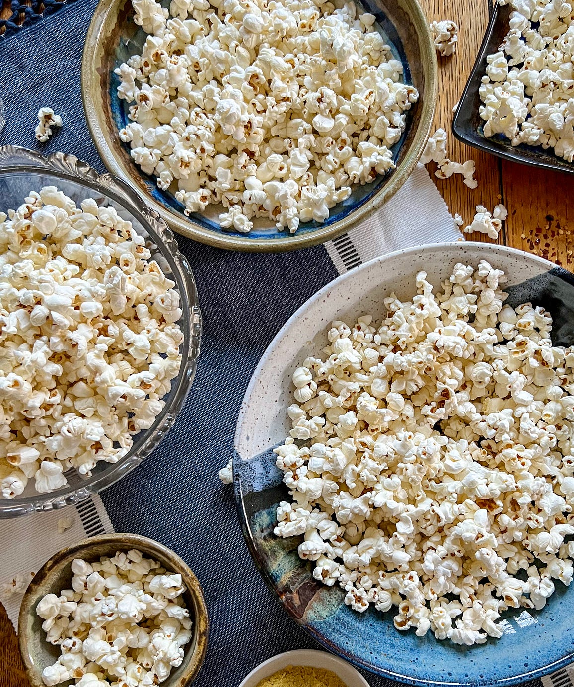 Popcorn is a low-cost multi-sensory experience. You smell, hear, see, taste, and feel the kernels as they go into your mouth. Just weeks ago when we were in pre-holiday mode I mentioned that my favorite stupid-easy appetizer was freshly popped popcorn with nutritional yeast sprinkled over. It’s not fancy by any means, but it doesn’t intend to be. Which is why I wanted to write about it this first week of the new year. It is everything I want the first days of January to be when I have one toe planted in 2022 and the others moving forward to 2023.