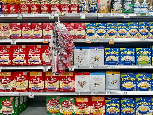 It’s America’s oldest snack and the ‘’great equalizer,’’ according to the brilliant writer Betty Fussell, author of The Story of Corn. ‘’Popcorn bags the past with the present and evokes even in old age the memories of childhood. We eat it not because it’s good for us, which it is, but because it’s joke food, and Americans love joke food. We eat popcorn for fun.’’ From Jiffy Pop to movie-theater butter to smarter pops to convenienceWe begged our mother to buy those Jiffy Pop all-in-one contraptions if friends were coming over. You placed the aluminum pan containing popcorn and oil on the stove, shaking the built-in handle to move around the kernels, and within minutes it swelled up like a balloon you slit to reveal the fat and crunchy popcorn inside. Back then popcorn was something you bought hot and fresh at the movie theater, so when Jiffy Pop allowed us fresh popcorn plus drama in our very own kitchens, it was an awakening. (And Jiffy Pop is still around on Amazon, but search the ingredients first because you might not like what you find… palm oil and the controversial preservative TBHQ.) Tending to lean healthy, while I was working in Atlanta I shopped at one of the first health food venues of the South—Sevenanda—in Little Five Points. It was a legit hippie food store, and amid the incense, home-farmed produce, vitamins, and yogurt makers were little brown sacks of freshly popped corn tossed with nutritional yeast. It was the best popcorn of my memory. When microwave popcorn came on the scene it meant you could take the taste and comfort of freshly popped corn with you, but somehow the popped corn got further from the field.It reeked of fake butter, and the very smell of it takes me back—not in a good way—to the newspaper cafeteria with its cloud of cigarette smoke and vending machines spewing Diet Coke and candy bars. So when I was raising young children who had reached the age they weren’t going to choke on popcorn and was living in Nashville with no Sevananda, I would NEVER buy movie theater butter-flavored microwave popcorn for them. Although I just found out daughter one would secretly buy packets from the Vanderbilt vending machines while she was at tennis camp… I would buy a jar of plain popcorn and pop my own. Boring, maybe, but it was a fraction of the cost and I could control the ingredients. Plus, back when microwaves and microwave popcorn itself were in their infancies, guessing how long to cook a packet involved some risk. One second too long and a putrid stench was cast for miles, seeping into memory banks. I asked daughter two if she recalled such an popcorn experience. ‘’If one idiot burns popcorn? Yes, the alarm goes off and you have to evacuate the dorm when you’re studying for exams. It’s annoying.’’ On my Nashville store shelf today, plain old-fashioned popcorn is crowded out by microwave and pre-popped corn. They go by names that draw us in—Skinnygirl, Lesser Evil—as well as the trusted Orville Redenbacher, founded by the Indiana agricultural scientist whose geeky knowledge of hybrid corn propeled his business to success about the same time James Baldwin was popping corn and reading to his friends. Marketing, packaging, and clever names have greatly affected what popcorn we buy. But what if we didn’t pay attention to the names or logos? What if all the popcorns were dumped into bowls and we tasted them blind to find the best? On January 1, with family in the house and this Substack to finish, I sent daughter one to Publix to buy a random assortment of popcorn. The only stipulation I made was that the popcorn be as unadulterated as possible so we could taste the corn. What I learned from a popcorn tasting is that popcorn is personal.Of our five tasters, my husband and son-in-law clearly wanted popcorn straight up and simple. No flourishes. They abhored - is that a strong enough word? - the popcorn popped in coconut oil. Two of the tasters, the daughters, loved the coconut-popcorn combination. They buy popcorn in coconut oil. Which leads me to my second take-away: We get accustomed to the popcorn we pop, buy, and eat regularly. It satisfies our crunch needs and has the right amount of salt, or none whatsoever. Our favorites were in order: