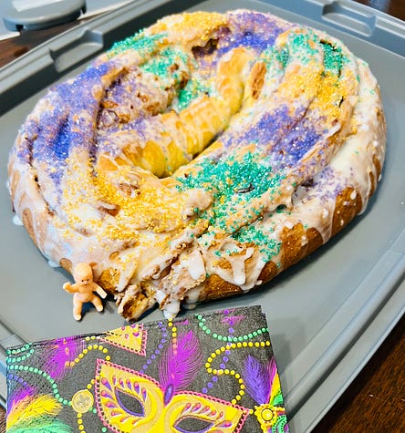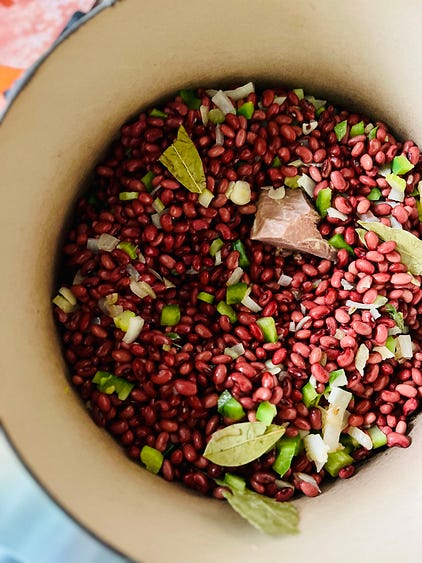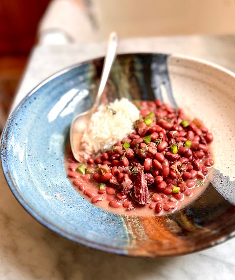 Good news! It’s Fat Tuesday, and that means a Fat Discount on an annual paid subscription to Between the Layers. Until March 1, upgrade to paid for just $40 for a year’s worth of full access to recipes and content. Fat Tuesday Red Beans & Rice - No. 192Let’s get a jump on Lent by cooking some beans, plus King Cake news!IT’S FAT TUESDAY, THE DAY WE COOK pancakes for dinner, fry up doughnuts and fritters, and slice into King Cake. But if that’s too much excess, just simmer up some red beans. I’ve written so much on King Cake at Between the Layers, and I’d love to mention my King Cake just won a bake-off over at Book Riot! Woohoo! You can read about it here. But this Fat Tuesday, I lean into savory—can you believe it?—and share a recipe unique to New Orleans but applicable anywhere because it’s cheap and delicious. This red beans and rice recipe comes from the late Daisy Fuller Young, a New Orleans native who was the mother of former Atlanta mayor Andrew Young. I received the recipe from her family many years ago when I was the food editor of the Atlanta newspapers. With her pot of beans simmering on the stove in the background and with the assistance from some of my favorite cookbooks, I dive into a red beans and rice story today. ‘’Red Beans and Rice-ly Yours’’ - Louis ArmstrongBack when hams were baked for Sunday dinner and washing was done on Monday, red beans were simmered along with that leftover ham bone in a large iron pot. New Orleans historian Liz Williams writes in her 2013 book, New Orleans: A Food Biography, ‘’A person who has to tend a washtub and heat hot water all day could tend a pot of red beans... It would also allow the efficient use of fuel, for when else would there be a time when a fire would be tended all day?’’ So Mondays evolved into red beans and rice day in New Orleans, and that’s when you’d find them simmering in homes, school cafeterias, and restaurants. Although with tourists roaming the streets in search of red beans and rice today, they’re cooked most any day. New Orleans’ favorite brand of the little red beans, which are smaller than kidney beans and cook up creamy and yet hold their shape, is Camellia. If you visit New Orleans, be sure to stop in a Rouse’s market and grab several bags to take home. But if not, you can buy the very lovely small red Domingo Rojo beans from Rancho Gordo. The traditional liquid for red beans and rice is simply water because you’ve got a piece of ham in the pot to flavor things up. And authors Rima and Richard Collin write in their 1975 The New Orleans Cookbook that the marrow from the ham bone gives the beans their distinctive creamy, almost baby food-like texture. They are purists and insist you need a ham bone, and if you can’t find a bone-in ham you can buy a ham bone from a butcher and keep it in the freezer until you want to simmer a pot. But I didn’t use a ham bone and instead made use of a bit of holiday country ham still in my freezer. Daisy Young used a ham hock. Her trick to imparting a creamy texture was to mash a portion of the beans against the inside of the pot and release them back into the broth. She never, ever used flour to thicken the juices. Recipes differ as to what type of meat to add to the pot depending on where you call home. In New Orleans, Creole red beans are simmered with pickled pork, according to Lena Richard in her 1939 Lena Richard’s Cook Book. ‘’Just before ready to serve add parsley and salt and pepper to taste,’’ she instructs. But out in the country, ‘’In Madisonville, where I grew up,’’ writes Leah Chase in The Dooky Chase Cookbook (1990), ‘’we would use smoked ham to add flavor to our red beans.’’ Toni Tipton-Martin says in her 2019 book, Jubilee, that author Freda DeKnight once recalled the strong connection between New Orleans, red beans, and jazz trumpeter Louis Armstrong. Red beans are brightly flavored with spices, and seasoning them is an art. Armstrong was known to say, ‘’old man, season them well! Add the right spices at the right time, and man, you have a ‘Date with a Dish’ that’s just about the greatest.’’ DeKnight would go on to name her famous cookbook just that, Date with a Dish. Louis Armstrong was known for his signature salutation, ‘’Red Beans and Rice-ly Yours.’’ And, if you love trivia, I’ll share this: He just so happened to be a dental patient of Daisy Young’s husband, Andrew Young, Sr. No wonder red beans and rice are a religious experience. They contain the holy trinity of seasoning…onion, celery, and green pepper. Besides the connection to Mardi Gras, red beans and rice offer something else—the best aroma ever. It is perfuming my house while I write this letter to you. Is it the green pepper, the onion, or the celery, or all of the above? Together they are known as the holy trinity. Only in New Orleans! After the trinity is briefly sautéed, I add that piece of country ham and know salt seeps out of it as the beans cook. So I don’t add any extra salt until the end of cooking because salt makes beans tough. Rancho Gordo suggests you only add salt to dried beans once they cook long enough to soften. But cayenne, red pepper pods, fresh or dried thyme, parsley, bay leaf, they have no effect whatsoever on bean tenderness, so add them as often as you like during the process. A note about water: I pre-soak beans overnight, which shortens the cooking time. And I begin with about 6 cups of water but keep 2 cups in reserve for adding to the pot as they cook down. And I stir the pot every half hour, and in about 2 1/2 to 3 hours, really depending on whether or not you pre-soaked the beans and the heat of your stove, you will have creamy cooked beans and enough ‘’gravy.’’ If you’ve added meat to the pot, shred it into smaller pieces and stir it back in. Or, if you haven’t, now’s a good time to slice some cooked smoked sausage and sear it off in an iron ski