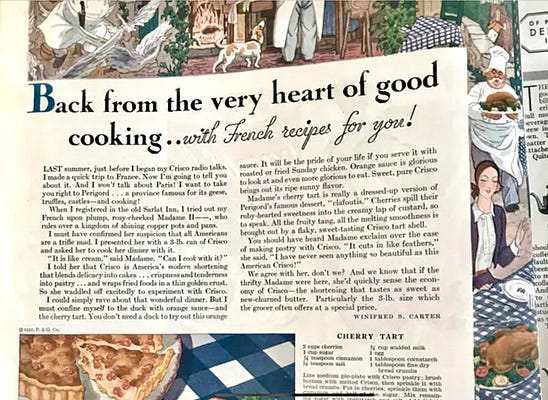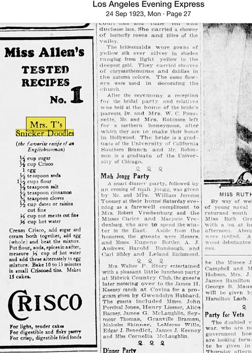 The skinny on trans-fatsI know the Crisco texture because I was raised making chocolate chip cookies with Crisco or with half Crisco and half butter. That was the recipe on the back of the Nestle bag. Crisco was created in 1911 by a process called hydrogenation or adding hydrogen to a liquid oil to make it semi-solid. It was something P&G was already doing to make soap from cottonseed oil. You could spread Crisco like lard or butter to grease cake pans, and if you added it to roll recipes, they became lighter. Compared to rancid animal fats, yes, Crisco was easier to digest. But we now know that these partially hydrogenated fats, or trans-fats, clog the cardiovascular system. In 2013, the Food and Drug Administration stated partially hydrogenated oils are no longer Generally Recognized as Safe (GRAS) in human food. Manufacturers were asked to remove them. Crisco was sold to J.M. Smucker in 2002 and to B&G Foods in 2020. Today it contains soybean oil, fully hydrogenated palm oil, and palm oil. The nutritional labeling states no cholesterol and no trans-fat, but in truth, the FDA doesn’t care about fractions of percentages, and Crisco contains less than 1 percent trans-fat but more than 0. So, getting to the recipe I share today, I let you decide what fat to use. In 100 years since Snickerdoodles were a thing, we not only bake in a new way, but we bake our way. I call for some Crisco to make the cookies light and fluffy and some butter to give them flavor and crispiness. (In effect, it is a truce, but a delicious one.) But you can go your own way and make them in Winifred’s fashion with all shortening or Nellie’s way with all-butter. Or, try them with coconut oil, a white solid fat. Is it irony or just human nature that 100 years ago our grandmothers were infatuated with someone who didn’t exist? And that someone convinced them to ditch butter and bake with Crisco instead?As I was about to hit publish on this post, I came across an obituary for a Laura Ritter Ruttkay of Cincinnati, who died just three years ago. She was born in 1929 and ‘’wore a hat and white gloves to P&G every day to work in the complaint dept as Winifred S. Carter.’’ She was also a bridge champ, Girl Scout leader, excelled at needlework, and helped her husband start his own business. Laura Ruttkay was one of the many faces behind P&G’s Winifred S. Carter…women who changed how we bake. Marketing a new way of cooking and baking was big business back then, and such dishonesty might not happen today, right? But what about artificial intelligence, tracking ads, and Alexa? Are they, without our knowing, coercing us into changing our cooking and baking habits? I think I’ll go bake a batch of Snickerdoodles and ponder it all. And if I’m feeling fancy, I’ll use a more intense Ceylon or Saigon cinnamon, because in the beginning, 100 years ago and more, Snickerdoodles were all about the cinnamon, the sugar, and the silly name. Happy Baking! - xo, Anne For Thursday paid subscribers: Open Thread and a Snickerdoodle Cake!I share the Snickerdoodle Cake recipe above, plus let’s talk kitchen appliances. What are your favorite brands, are you cooking with induction? Do you want to? (We expect our British friends to weigh in on Aga, btw.) What’s the best fridge for the money? What do you love about your current kitchen? What do you hate? You will receive an email from me Thursday morning, and then the conversation starts… THE RECIPE: Shirley’s SnickerdoodlesThis recipe belonged to Shirley Hutson, the recently departed mother of my friend and recipe tester Martha Bowden. The leavening in this recipe is a combination of cream of tartar and baking soda, an old-school combo that together makes baking powder. It gives Snickerdoodles their characteristic lightness and makes them feel nostalgic. Add a little nutmeg to the topping if you like, and as I mentioned above, use the fat of your choice. For all butter, use two sticks. The cookies will be crispier but less soft and pillowy. Makes about 4 ½ dozen cookies Prep: 15 to 20 minutes Bake: 8 to 10 minutes