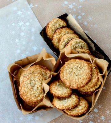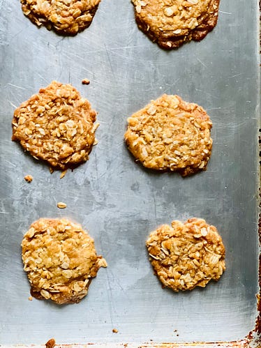 To celebrate two years together, here is that recipe. If there’s one thing I’ve learned from these past two years, it’s that we’re never too old to ask questions. And we’re never too young to think the world doesn’t need our perspective.Have a great week and happy baking these two kinds of biscuits. (One is like a cookie, and the other is more like a scone. But don’t get me started on biscuit differences because we’ll be here all day!) - xo, Anne Coming Thursday for paid subscribers, an Open Thread! Look for the email Thursday morning. We will talk wedding and graduation gift and menu ideas for spring! Mother’s Day, too! Plus, I’ll share a fabulous and easy caramelized onion pizza for spring get-togethers. And because it’s my second birthday, and I’d love more of you to become paid subscribers and support my efforts, which lets you access all the recipes and content, I’m giving you this gift: THE RECIPE: Anzac Biscuits (Cookies)This is such a straightforward pantry-driven recipe. The only ingredient that might not be found in an American kitchen is the golden syrup, but we have options. Use some honey or maple syrup, or use cane syrup if you live in Louisiana and have that close by. I have a jar of sorghum from East Tennessee and used half sorghum and half light corn syrup. As for the sugar, vary it as you like. I prefer a mix of brown and white in oatmeal cookies because the brown makes things interesting and more chewy. White sugar makes cookies crisp. Makes 30 to 36 2 1/2-inch cookies Prep: 10 minutes Bake: 10 to 12 minutes