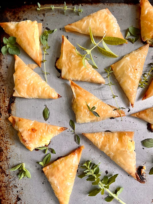 THE RECIPE: Anna Maria’s Cheese TiropitasI could see why this artist and seamstress, painter and quilter enjoys the process of making tiropitas. There is repetition to them, and undoubtedly there could be conversation in the kitchen while these little pastries are being assembled. It helps if you’ve worked with phyllo before, but even if you haven’t this is a good place to begin. Let the frozen phyllo thaw overnight in the fridge like the package says. Have your filling ready and the butter melted before you open the package because phyllo dries out quickly. Anna Maria serves these as a side dish to roasted lamb or often makes them a main dish with a salad. I give you options for dressing up the filling even though Anna Maria and her family like them plain —‘’basic and yummy.’’ Makes about 36 tiropitas Prep: 1 hour Bake: 20 to 25 minutes