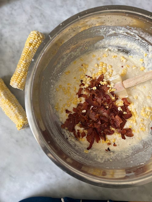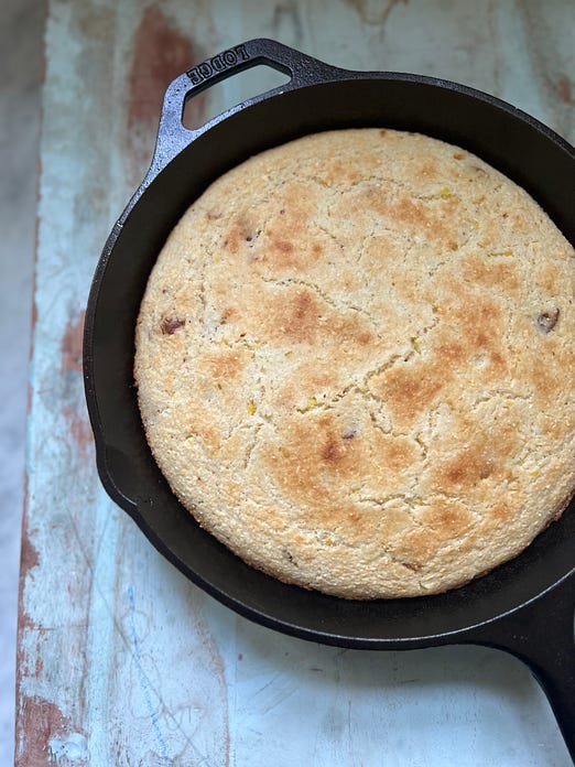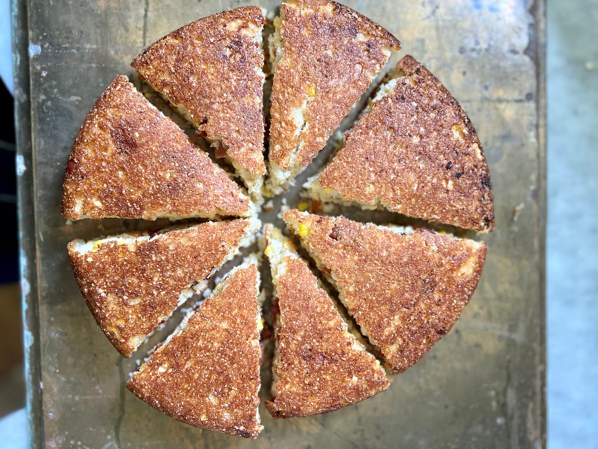 Thank you for reading Between the Layers! Simply the Best: Tina Turner’s CornbreadBetter than all the rest…With crumbled bacon and fresh sweet corn, it’s a tribute to Tina and summer.WHEN I HEARD THAT TINA TURNER had died, I pulled out her recipe for cornbread. And with What’s Love Got to Do With It playing in the background, I reached for the buttermilk at the back of the fridge. Tina was born in west Tennessee. She must have loved cornbread and known its natural attraction to beans and greens, barbecue, and summer’s sliced tomatoes. She must have known how cornbread fits in anywhere. It may look poverty square in the eye, but it’s been baked at the White House, too. You can drag a slice of cornbread through what’s left on your plate or make a meal of it. Old timers used to crumble it into a tall glass of buttermilk. I used to think—just like a lot of people—that cornbread had to be made a certain way. But it really doesn’t. It doesn’t have to be white or yellow or sweet or unsweet. It can be personal. It can be you. Cornbread from a motel room hot plateI stumbled upon the story of Robbie Montgomery, one of the Ikettes with whom Tina Turner and her ex-husband Ike would perform and travel in the 1960s. Once they had played Proud Mary and all those songs in the rousing last set, they’d head back to their motel room, Robbie says, because with Jim Crow laws, Blacks couldn’t dine just anywhere in the South and Midwest. Robbie would stir up cornbread batter and plug an electric hot plate into the wall. ‘’I'd pour the batter in the hot skillet, cook it for a bit, put a plate on top of it, and then turn it over onto the plate. Then I'd slide that cornbread back into the skillet real gentle so the other side could finish browning up. Once it was done and you tasted a slice, boy, you could die!" - Robbie Montgomery in her Sweetie Pie’s Cookbook. I tried this method once, and it’s doable if you get the hot plate under the iron skillet very hot or use an electric skillet set at 350ºF, and then flip the cornbread like a big pancake so it browns on both sides. Tina’s cornbread is rich with bacon and sweet with cornEven if you don’t know Tina Turner’s story you might be touched by her rags to riches life, surviving discrimination in the 1960s’ South and then an abusive marriage. Tina was born Anna Mae Bullock in 1939 in Brownsville, Tennessee, and raised in the small community of Nutbush nearby. It was cotton country where you got rich if you owned the land and stayed poor if you didn’t. She was distanced from her mother. ‘’She never believed in me,” Tina Turner told Oprah Winfrey. “She never wanted this child and when this child grew up to be successful and creative, she didn’t accept it because it was something she didn’t want. Why would she want it? Maybe jealousy. Is there such a thing as a mother’s jealousy? I don’t know. Obviously that must’ve been the case because it never went away.” After being dropped by Capitol Records and her life imploding, David Bowie helped her get re-signed to the record label, and what followed was the bestselling Private Dancer album, which featured the Grammy-winning 1984 song playing in my kitchen as I baked her cornbread. Tina would leave the United States, marry a longtime love, and move to Switzerland. Movies have been made about her. She packed stadiums and gained a loyal following and created a life in Europe that she sadly could have never found in America. Everyone’s cornbread has a storyIn the fall of 2019 I helped stage a Taste of Nashville event at the Tennessee State Museum for a Les Dames d’Escoffier conference. A handful of food writers like myself —Jennifer Justus, Nancy Vienneau, Alice Randall, and Mindy Merrell—researched the books and archives of The Country Music Hall of Fame. Our objective was to create a menu that would speak to famous women in music in Tennessee in addition to Dolly, Loretta, and Tammy. This cornbread recipe I share today was on the menu. To me, sweet corn in the title says freshly shaved corn off the cob. Tina’s recipe called for yellow cornmeal, too, and this is typical of west Tennessee, Arkansas and Texas, whereas in other parts of the South, cornbread is often made with white cornmeal. I had some white hickory king cornmeal from Sunflower Sundries in Mt. Olivet, Kentucky, in my freezer. Substack writer Rona Roberts had told me about it, and it tastes of fresh corn. You can use white or yellow cornmeal in this recipe, and you can use stone-ground or more finely milled cornmeal as well. Many people have added a little flour and an egg to make cornbread more cakey. Just as many have folded in pork cracklins’ or crumbled bacon to give cornbread more sustenance. Some of us were raised heating vegetable oil in the skillet before we pour in the cornbread batter, while others have used lard, bacon grease, or butter. We all make cornbread differently, which is what makes it interesting. Cornbread is one of those recipes we never tire of, and I think Tina Turner would want us to make cornbread our own way. But today, this week, this summer, I’m baking it her way. Do you love Tina Turner? Love cornbread?Have a great week! - xo, Anne A little housekeeping & what’s coming Thursday for Paid SubscribersWelcome to all the newcomers! Today’s Tuesday post with recipe is accessible to everyone. It is free. On Thursdays, I offer a second post a week for my paid readers who want more and who want to support Between the Layers and the work I do here. This Thursday, I peek inside my summer pantry, share a favorite potato salad recipe, and give an overview of what you’ll be reading in Between the Layers this summer. I just need to keep reminding myself that summer is here! THE RECIPE: Tina Turner’s Sweet Corn and Bacon CornbreadYou’ll need a 10-inch cast iron skillet and the cornmeal of your choice. If you don’t have buttermilk, use plain yogurt instead. It