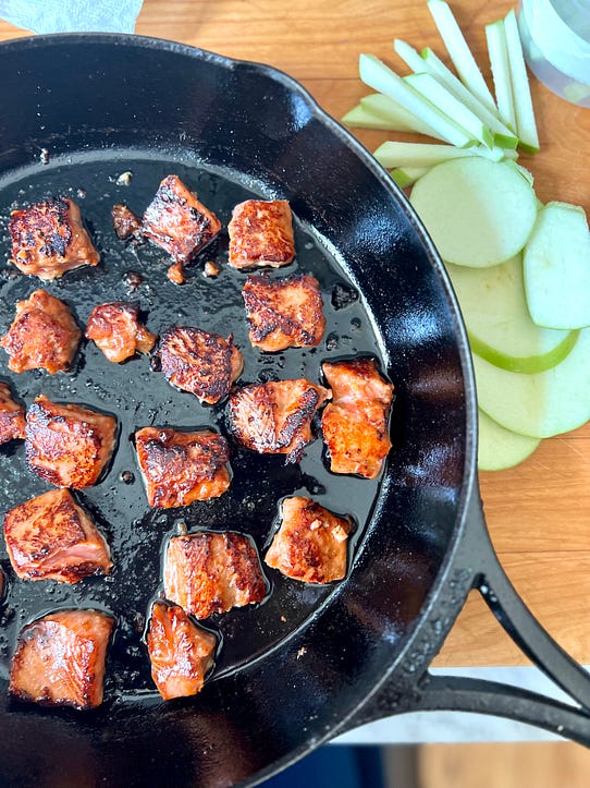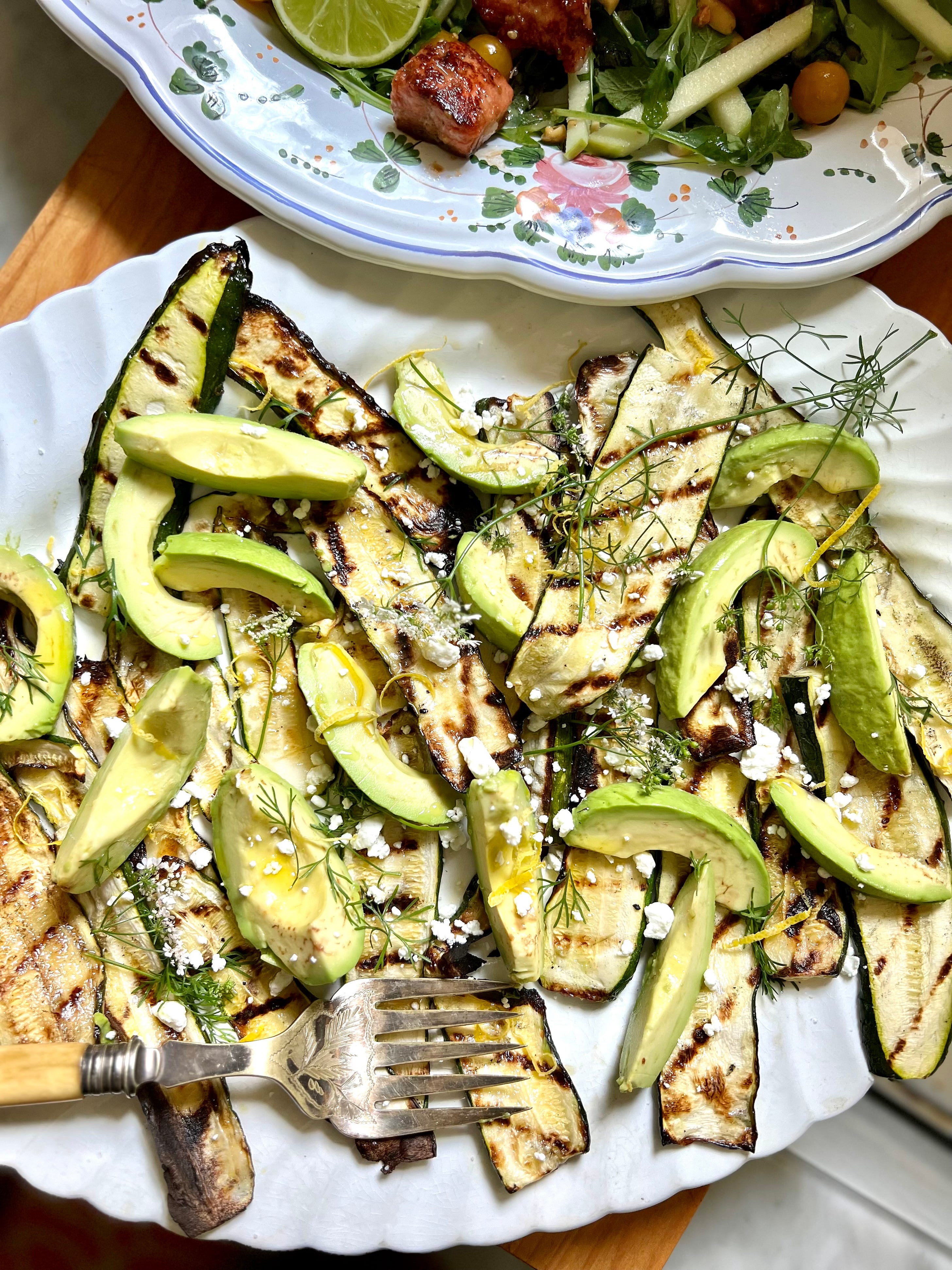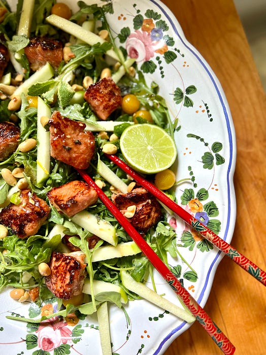I appreciate your reading Between the Layers. This is a Thursday post sent to paid subscribers, and I wanted you to receive a preview so you’ll see what you’re missing! Paid subscribers allow me to produce creative and original posts with tested recipes and photography. If you’re able, I’d love for you to consider becoming a paid subscriber! Two Artful (and delicious!) Platter Salads - No. 217One inspired by Frida Kahlo and the other by Anna Maria Horner. Plus a surprise appearance from Martha. Ready or not, summer is here!WE EAT FIRST WITH OUR EYES. That saying has been attributed to an 18th century Chinese poet who wrote if we eat first with our eyes the food will keep coming and coming and there will be far too many courses. The poet must have known the truth to warn against it. What’s so wrong with wanting to eat a beautiful salad? In 1930s Mexico City, artists Frida Kahlo and her husband Diego Rivera hosted festive dinner parties that Frida called "día de los manteles largos," the days of the long tablecloth. In a 1994 book called Frida’s Fiestas, by Marie-Pierre Cole and Guadalupe Rivera, the grandson of Diego, I found a recipe for her simple salad of grilled zucchini, avocado, and salty, crumbled añjeo cheese that might have been served at one of those dinner parties. The salad was part of a meal that appeared in a 2014 issue of Saveur magazine. A visual, artful salad isn’t new, and yet it’s something to remember as we head into summer. Switching out of winter salad into summer salad mode is much like refreshing your closet.I did a quick scan of my pantry and pulled forward the lighter rice and white balsamic vinegars, and for the time being, moved the red wine and cider vinegars to the back. I put another bottle of avocado oil on my shopping list. I had a nice ripened avocado, and when I opened the fridge I saw a few zucchini. For salad one, I was quickly on my way to making Frida’s salad. You can take the short route and bedazzle her salad with a squeeze of lemon juice or dash of white balsamic vinegar, a drizzle of avocado or olive oil, and a sprinkle of kosher salt and grated lemon zest. Or you can kick off summer with a bang and make an herby feta dressing to snuggle up to the avocado and grilled zucchini slices. I offer both versions. My daughter Kathleen, the salad guru, pointed me to a feta dressing that originally was in a Martha Stewart book, but she’s added all kinds of herbs to it and would recommend goat cheese or the anjeo in lieu of the feta, so now it’s an herby, garlic and cheesy dressing you can make your own. A nod to Anna Maria Horner with a green apple salad with seared salmon.You might think as a newsletter writer who posts each week that I line up the interviews and knock ‘em out in rapid fire. That’s a little true, but it’s more the case that I get so involved in the subject matter I have trouble parting with it. I learn along the way, which is what keeps writing about food and cooking so interesting to me. When I spoke with artist Anna Maria Horner for the Tuesday post, and we discussed Frida Kahlo, Anna Maria mentioned a salad she had eaten recently that she couldn’t get out of her mind. She had been in Sydney on business and was dining at a Thai restaurant and ordered a salad of salmon and green apple with mint and bright flavors, and she had tried to recreate it once she was back home in middle Tennessee. I scratched my first idea of ‘’Salade Cubism’’—cubes of apple and roasted salmon tossed in a ginger and lime vinaigrette. It feared it might look like my mother’s Waldorf, as if she had tossed in chunks of canned salmon, so I thought a bit deeper as I added wild-caught Coho salmon to the shopping list. I had some fish sauce, mint, a few limes, and even two green apples in the fridge. I asked Kathleen about that salad as well. She suggested I toss the salmon with grated ginger before roasting. She also suggested sesame oil, chopped roasted peanuts as a garnish to the salad, and a ginger, lime, and chile vinaigrette she had made from one of her favorite salad books called Salad Freak by Jess Damuck, who had worked for Martha Stewart for a decade and made her a salad for lunch most of those days. When Time magazine interviewed Jess Damuck as to why she wrote an entire book on salad, she said: ‘’More often than not, Stewart requested a salad, and she’d dole out some vague instruction, like, ‘I’m in the mood for something light and fresh and truly delicious today.’ ‘’ I can see that conversation taking place. Martha on chaise lounge, fanning herself, craving a light and fresh salad… So there you have it. Two salads.That’s how I came to construct two artful salads honoring two talented women and built them with what’s in my pantry and a few new ingredients that might continue to freshen up my recipes this summer. And I leaned into talented women for ideas, too. I also fell back on instinct. It’s the little things that get our attention, right? The swap out of a lighter vinegar in the dressing. The introduction of a different herb like mint or fresh basil that say summer. And most of all, when you’re all done, it’s a plate of artful, blazing COLOR—the vivid greens, the lemon yellows, rosy salmon, brightness to wake up our palate and say, ready or not, summer is here. Happy Cooking and Happy Memorial Day!