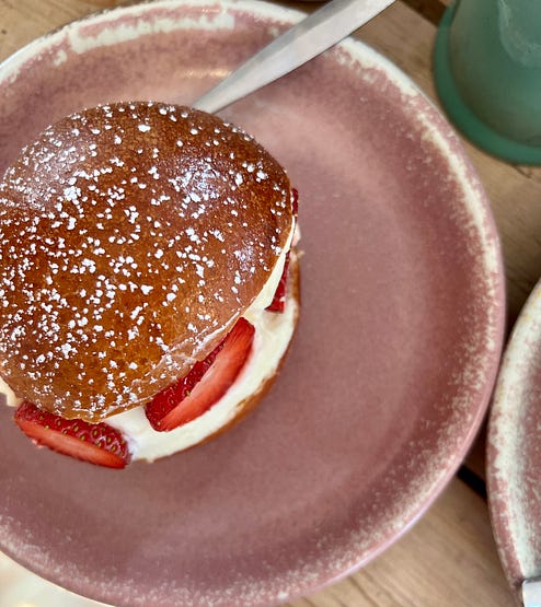 Have a great week! And thank you, Ciara! - xo, Anne And here’s how to save on an annual subscription to Between the Layers! It’s an August sale - a paid subscription for just $40.This week, for Thursday’s paid subscribers, I bake a fabulous fruit tart of peaches, blueberries and cherries with Ciara’s recipe for creme patisserie inside. It is so beautiful in a rectangular tart pan! If you’ve thought about going paid and supporting my work, plus grabbing this wonderful recipe, this is a great time! A PEACHY RECIPE: Peach Breakfast for OneCiara laments she was born in the wrong country for peaches: ‘’If I had to pick a favourite fruit it’d be a perfectly ripe peach. Something about that fuzzy fragrant skin, so tactile and pleasing in an eye closed, deep breath joyful way. The soft, super juicy orange flesh with slurpy sweet liquid running down the chin.’’
