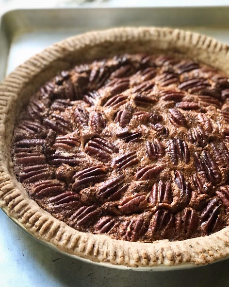 Sides also remind you of Thanksgiving pasts and people no longer at the table. We make scalloped oysters in honor of my mother-in-law who knew exactly how many fresh oysters to order. I remember to pour turkey drippings over the dressing before it goes in the oven because my mother told me that was the secret to great dressing. And if you are a vegetarian then you already know that sides enable Thanksgiving—or a winter potluck—to feed everyone. They are like one of Anna Maria Horner’s dazzling patchwork quilts offering textures and colors that when spread on the table turn the most revered meal of the year into a visual masterpiece. On a deeper level, they remind us that in spite of our differences, we have much in common. If there was a year to embrace someone else’s favorite side, this is it. And desserts like Steve’s Pecan Pie count as sides, too!