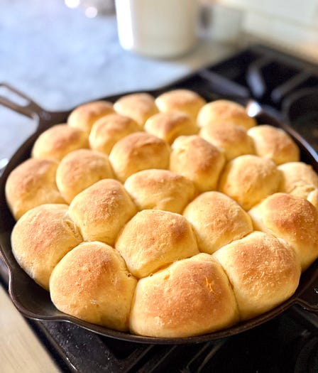 I hope you enjoy this issue of Between the Layers! Share it with your friends. Imagine a Perfect Thanksgiving Dinner Roll - No. 365Or a better world. This sweet potato dough is a start.LAST WEEK I SPOKE ABOUT SOUTHERN baking and culture to the ladies of The Fortnightly of Chicago, an organization founded in 1873, two years after the disastrous Chicago Fire. That catastrophic October blaze burned through crowded wooden houses and roads in what was beginning to be an American boom town, and it would spark a renaissance. Hundreds of thousands were without housing, and the rebuild after the fire was of stone, brick, and steel. At first, the Fortnightly ladies met in each others’ homes, and in 1922 they purchased the Lathrop House, a grand Greek Revival residence, from one of their members. Each fortnight, they hosted a speaker who would not discuss politics, religion, or business interests, just culture and how to make Chicago a better place. One of their founding members included Jane Addams, the first woman to receive the Nobel Peace Prize in 1931. During World War I, Addams promoted international peace and believed human beings were capable of solving disputes without violence. Decades earlier she was a leader of the settlement movement and founded Hull House on Chicago’s industrial west side. Here educated women from the Fortnightly shared all kinds of knowledge, from basic housekeeping to arts to literature with poorer people in the neighborhood. She founded the first juvenile court in the nation. Another Fortnightly member was Bertha Palmer, society matron, art collector, and head of the board of lady managers at the 1893 Colombian Exposition in Chicago. She helped orchestrate a cookbook called Favorite Dishes: A Columbian Autograph Souvenir, compiled by Carrie V. Shuman, in which women from every U.S. state (there were 44 states at that time, fyi) submitted recipes. The Columbian Exposition celebrated the 400th anniversary of Columbus’s first voyage, and the cookbook was intended to show off the unique qualities of regional American cooking. I was fortunate enough to spend time with two special people in Chicago, my husband’s cousin, Atlee, a member at the Fortnightly, which is how I was invited to speak. And Jolene of Time Travel Kitchen, my friend here on Substack, who has written about Bertha Palmer and has a first-edition copy of Favorite Dishes on her shelf. I was able to peruse that old book while she was making me a cup of tea in her apartment that overlooks Lake Michigan. The Fortnightly women were the MacKenzie Scotts of our era. They imagined a better city, and they put their money to work for good. They imagined that women from all states could gather and share ideas, which would plant seeds of hope in their own hometowns. They were part of the Progressive Movement, a byproduct of the Industrial Revolution and all the woes it brought—air pollution, dirty water, filthy streets, child labor. Chaos and improvement are the give-and-take woven throughout our American story, and it’s how life works. When society moves too much in one direction, it finds a way of correcting itself. It’s called progress. What made the Progressive Movement interesting when it comes to food was that many of the recipes we follow today were born during this time. Layer cake, in particular, came out of a dedication to better baking with novel ingredients such as baking powder. These cakes were sliced and served to women meeting and imagining change. Flying back from Chicago, fingers crossed that my flight was on time and the air traffic snafus from the government shutdown wouldn’t affect me, I arrived at the airport early enough to think about this newsletter. I got to imagining what I was going to write about and had seen an image on Instagram of these shiny dinner rolls baked in an iron skillet with a glaze of maple syrup and butter. They were finished off with sea salt. I imagined one in my mouth, and my stomach grumbled from hunger. What if those rolls were the most exquisite Thanksgiving roll dough ever? What if they were made from sweet potatoes that impart a warm soft orange color, flavor, and rich texture? What if I glaze some with butter and maple as well as butter and sorghum, the amber syrup native to the Midwest and upper South? What if I took it one step further and turned some of the dough into next-day cinnamon (or possibly, cardamom) rolls to have ready for Thanksgiving breakfast?(That recipe is fabulous, and I’m sharing it with paid subscribers later this week!) To be honest, I had so much fun imagining what I’d do with a recipe of bread that my flight was boarding behind me. Once we landed, I headed to the store for sweet potatoes, and the recipe today made my kitchen smell soooo good. The world seems broken around us. The Fortnightly ladies must have felt that, too. In spite of the news about the Epstein files and ICE cruelty now in Charlotte, look at the recent outpouring of generosity to food banks. When SNAP payments were delayed and reduced, people helped. Hunger is nonnegotiable. That’s how I feel going into Thanksgiving 2025. I see something better for us all and am not afraid to imagine. Happy baking! - xo, Anne What do you imagine? What are you baking for Thanksgiving?P.S. John Lennon’s song Imagine has always been a favorite. The lyrics have resonated with me through the decades of my life. Written in March 1971 as a Vietnam protest song, it depicts a world where the priority is kindness and unity. President Jimmy Carter remarked how he had heard the song played in more than 100 countries around the world. And at his funeral on Jan. 9 of this year at the Washington National Cathedral, Imagine was sung by Trisha Yearwood and Garth Brooks. You can watch and listen to it here while you’re baking. THE RECIPE: The Best Sweet Potato Dinner RollsPotatoes of some sort have crept into dinner roll recipes for good reason. They’re often leftover, and they ma
